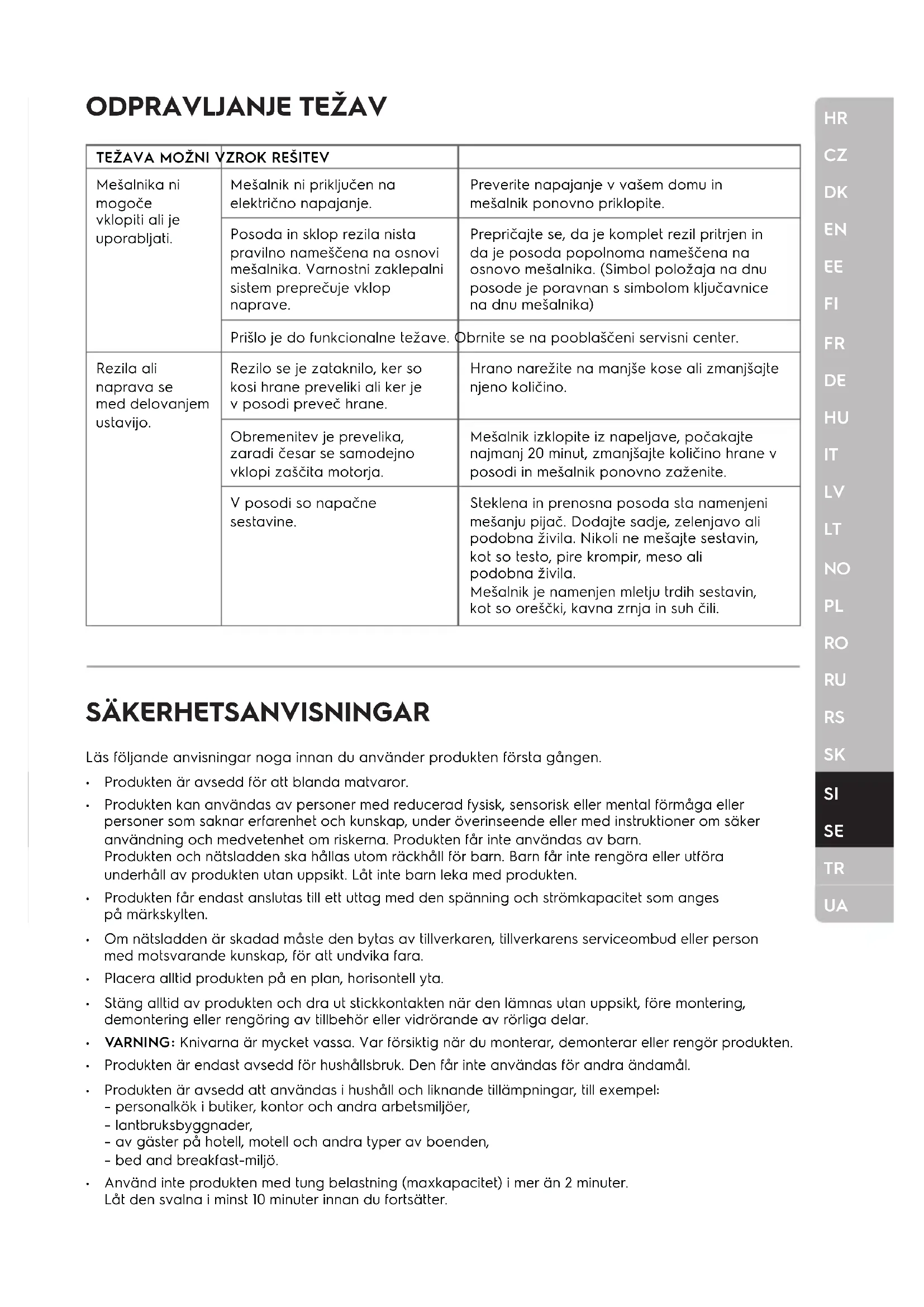 Produkten är avsedd för att blanda matvaror. Produkten kan användas av personer med reducerad fysisk, sensorisk eller mental förmåga eller personer som saknar erfarenhet och kunskap, under överinseende eller med instruktioner om säker användning och medvetenhet om riskerna. Produkten får inte användas av barn. Produkten och nätsladden ska hållas utom räckhåll för barn. Barn får inte rengöra eller utföra underhåll av produkten utan uppsikt. Låt inte barn leka med produkten. Produkten får endast anslutas till ett uttag med den spänning och strömkapacitet som anges på märkskylten. Om nätsladden är skadad måste den bytas av tillverkaren, tillverkarens serviceombud eller person med motsvarande kunskap, för att undvika fara. Placera alltid produkten på en plan, horisontell yta. Stäng alltid av produkten och dra ut stickkontakten när den lämnas utan uppsikt, före montering, demontering eller rengöring av tillbehör eller vidrörande av rörliga delar. VARNING: Knivarna är mycket vassa. Var försiktig när du monterar, demonterar eller rengör produkten. Produkten är endast avsedd för hushållsbruk. Den får inte användas för andra ändamål. Produkten är avsedd att användas i hushåll och liknande tillämpningar, till exempel: – personalkök i butiker, kontor och andra arbetsmiljöer, – lantbruksbyggnader, – av gäster på hotell, motell och andra typer av boenden, – bed and breakfast-miljö. Använd inte produkten med tung belastning (maxkapacitet) i mer än 2 minuter. Låt den svalna i minst 10 minuter innan du fortsätter.HR