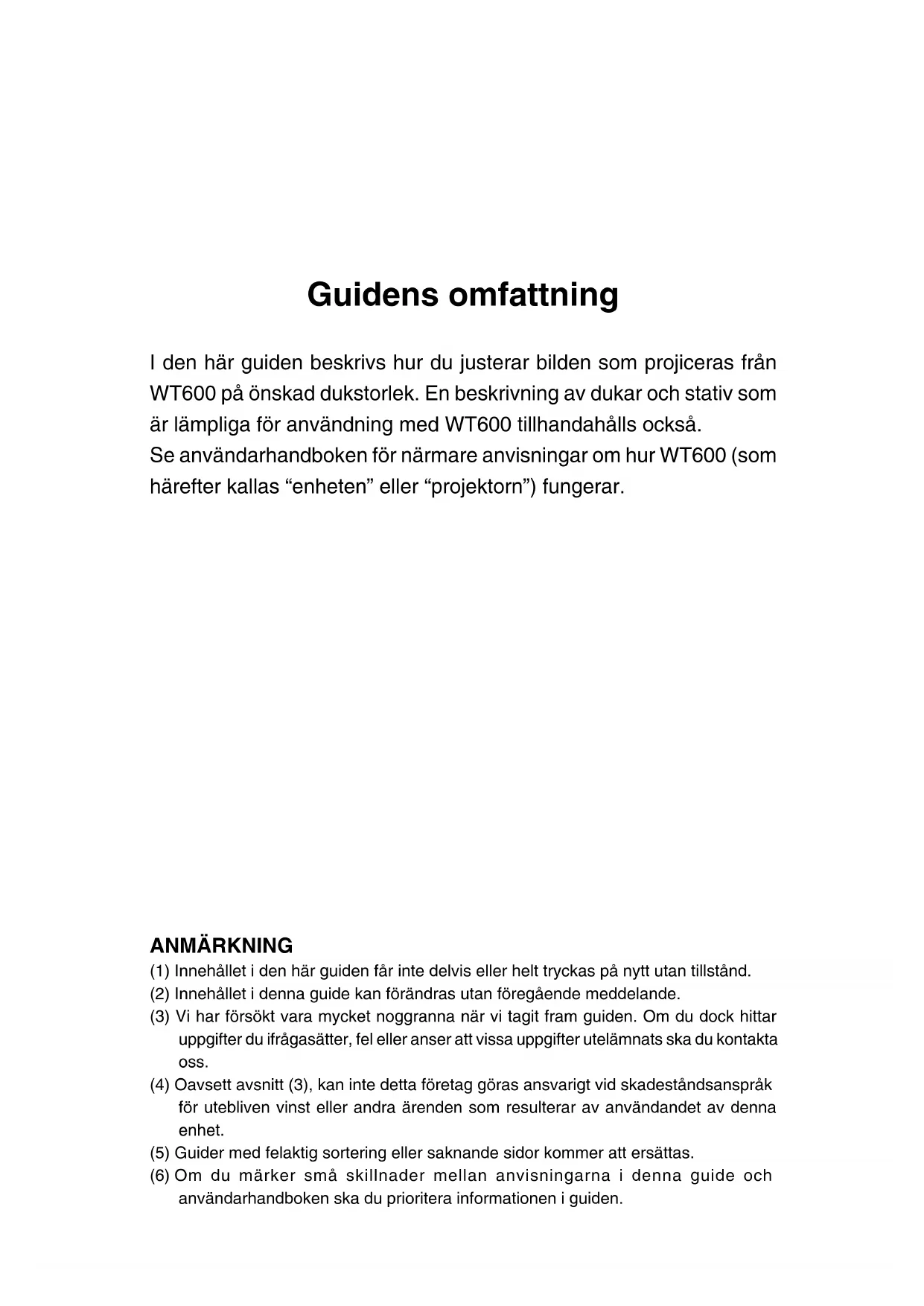 CON TROL REM OTE INANMÄRKNING (1) Innehållet i den här guiden får inte delvis eller helt tryckas på nytt utan tillstånd. (2) Innehållet i denna guide kan förändras utan föregående meddelande. (3) Vi har försökt vara mycket noggranna när vi tagit fram guiden. Om du dock hittar uppgifter du ifrågasätter, fel eller anser att vissa uppgifter utelämnats ska du kontakta oss. (4) Oavsett avsnitt (3), kan inte detta företag göras ansvarigt vid skadeståndsanspråk för utebliven vinst eller andra ärenden som resulterar av användandet av denna enhet. (5) Guider med felaktig sortering eller saknande sidor kommer att ersättas. (6) Om du märker små skillnader mellan anvisningarna i denna guide och användarhandboken ska du prioritera informationen i guiden. Guidens omfattning I den här guiden beskrivs hur du justerar bilden som projiceras från WT600 på önskad dukstorlek. En beskrivning av dukar och stativ som är lämpliga för användning med WT600 tillhandahålls också. Se användarhandboken för närmare anvisningar om hur WT600 (som härefter kallas “enheten” eller “projektorn”) fungerar.W-1 VARNING
