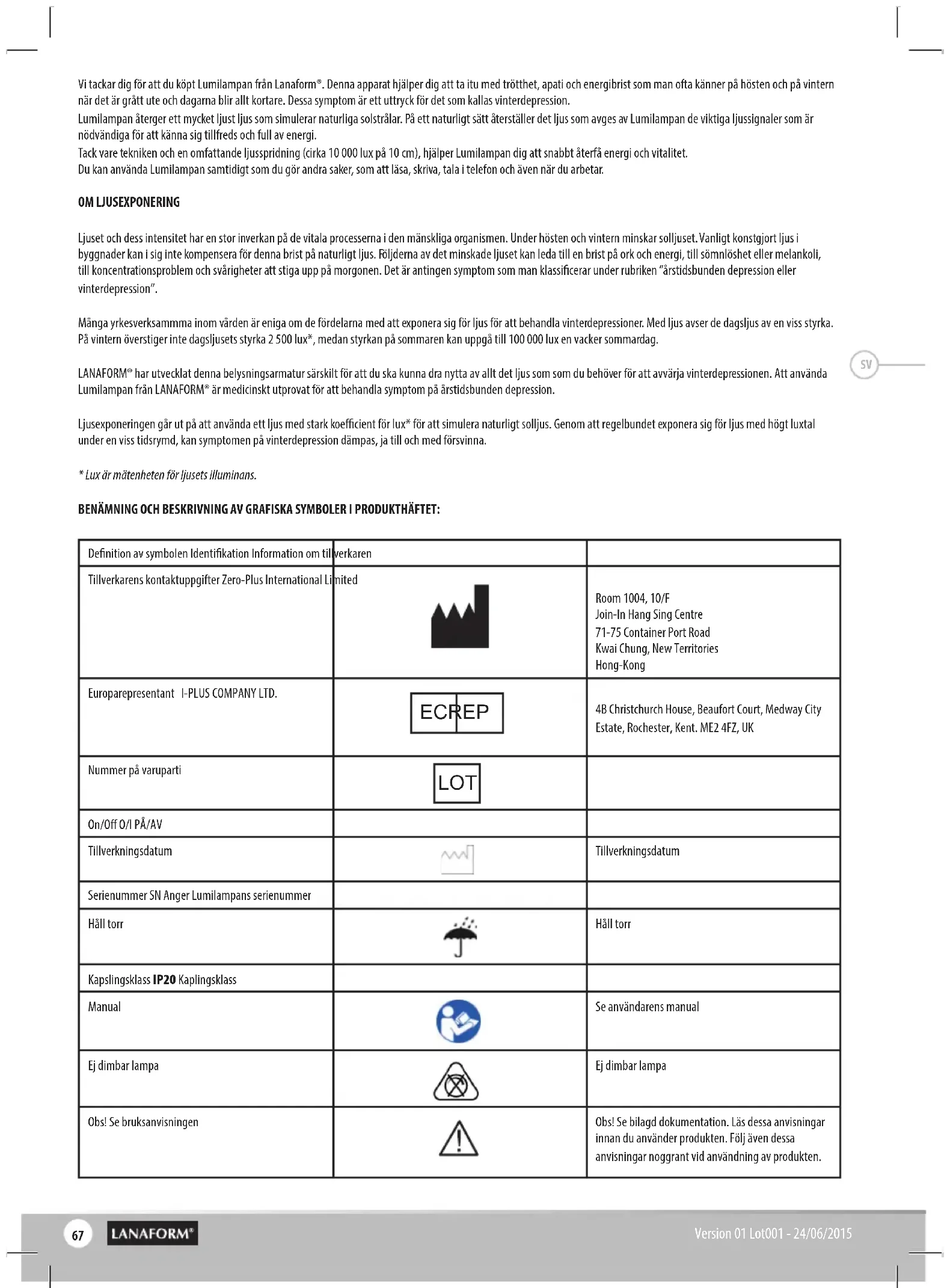 - Lux är mätenheten för ljusets illuminans. BENÄMNING OCH BESKRIVNING AV GRAFISKA SYMBOLER I PRODUKTHÄFTET: Denition av symbolen Identikation Information om tillverkaren Tillverkarens kontaktuppgifter Zero-Plus International Limited Room 1004, 10/F Join-In Hang Sing Centre 71-75 Container Port Road Kwai Chung, New Territories Hong-Kong Europarepresentant I-PLUS COMPANY LTD. 4B Christchurch House, Beaufort Court, Medway City Estate, Rochester, Kent. ME2 4FZ, UK Nummer på varuparti On/O O/I PÅ/AV Tillverkningsdatum Tillverkningsdatum Serienummer SN Anger Lumilampans serienummer Håll torr Håll torr Kapslingsklass IP20 Kaplingsklass Manual Se användarens manual Ej dimbar lampa Ej dimbar lampa Obs! Se bruksanvisningen Obs! Se bilagd dokumentation. Läs dessa anvisningar innan du använder produkten. Följ även dessa anvisningar noggrant vid användning av produkten. LOT EC REP SV68 Version 01 Lot001 - 24/06/2015 Se bruksanvisningen Läs bruksanvisningen som medföljer produkten Utrustning klass II Avfall från elektriska produkter (DEEE) CE-symbol CE-etiketten intygar att produkten följer de väsent- liga kraven I EU-direktiv 93/42/EEG om medicinska produkter LÄS ALLA ANVISNINGAR INNAN DU ANVÄNDER DIN DAY LIGHT, SÄRSKILT DE GRUNDLÄGGANDE SÄKERHETSRÅDEN: