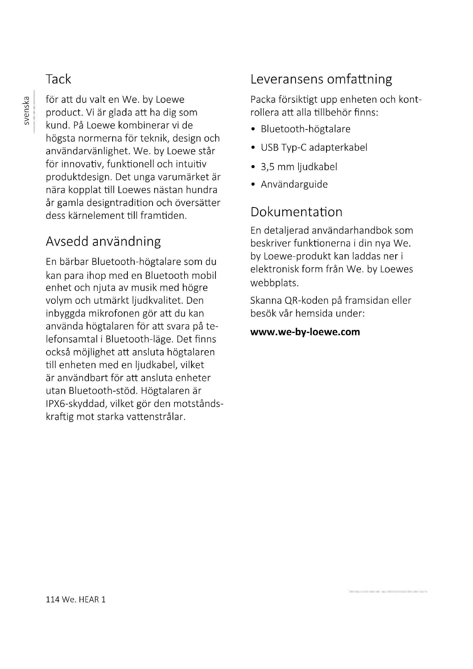- Användarguide Dokumentaon En detaljerad användarhandbok som beskriver funkonerna i din nya We. by Loewe-produkt kan laddas ner i elektronisk form från We. by Loewes webbplats. Skanna QR-koden på framsidan eller besök vår hemsida under: www.we-by-loewe.comWe. HEAR 1 115 svenska 1 Vikga säkerhets instrukoner Obs: Läs denna sida noggrant för a sä- kerställa säker användning av enheten. Förklaring av symboler Denna symbol indikerar risker som orsakas av höga spänningar. Denna symbol är för a varna användaren om andra, mer specika risker. Denna symbol indikerar faror orsakade av brandutveckling.