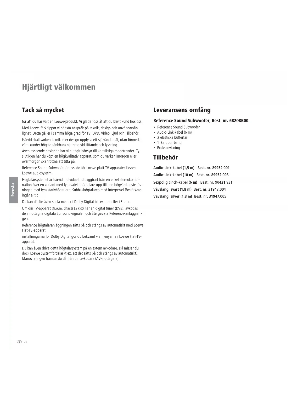 - Bruksanvisning Tillbehör Audio-Link-kabel (1,5 m) Best. nr. 89952.001 Audio-Link-kabel (10 m) Best. nr. 89952.003 Sexpolig cinch-kabel (6 m) Best. nr. 90421.931 Vävslang, svart (1,8 m) Best. nr. 31947.004 Vävslang, silver (1,8 m) Best. nr. 31947.00571 - Svenska Avfallshantering Pappkartong och emballage Du har bestämt dig för en hållbar och tekniskt so stikerad produkt. I överens- stämmelse med nationella föreskrifter avseende avfallshantering av förpack- ningsmaterial, betalar vi en avgift till auktoriserade återvinningsföretag, som samlar upp förpackningsmaterial från återförsäljare. Vi rekommenderar däremot att behålla original pappkartongen och resten av förpackningsmaterialet, så att apparaten vid behov, kan transporteras på säkrast möjliga sätt. Apparaten Viktigt: EU-direktivet 2002/96/EG reglerar korrekt återta- gning, hantering och återvinning av använda elektroniska utrustningar. Gamla elektroniska utrustningar måste därför avfallshanteras separat. Kasta aldrig bort apparaten i normala hushållssopor. Du kan lämna in din gamla apparat gratis hos motsvarande uppsamlingsställen eller hos din återförsäljare, om du köper en liknande ny produkt. Andra detaljer avseende återtagning (även för icke EU-länder) kan fås hos den lokala myndigheten. Rengöring Rengör ditt Reference högtalarsystem endast med en fuktig, mjuk och ren trasa (utan något aggressivt rengöringsmedel). För din säkerhet För din egen säkerhet och för att undvika onödiga skador på apparaten, om- bedes du att läsa och beakta följande säkerhetshänvisningar: