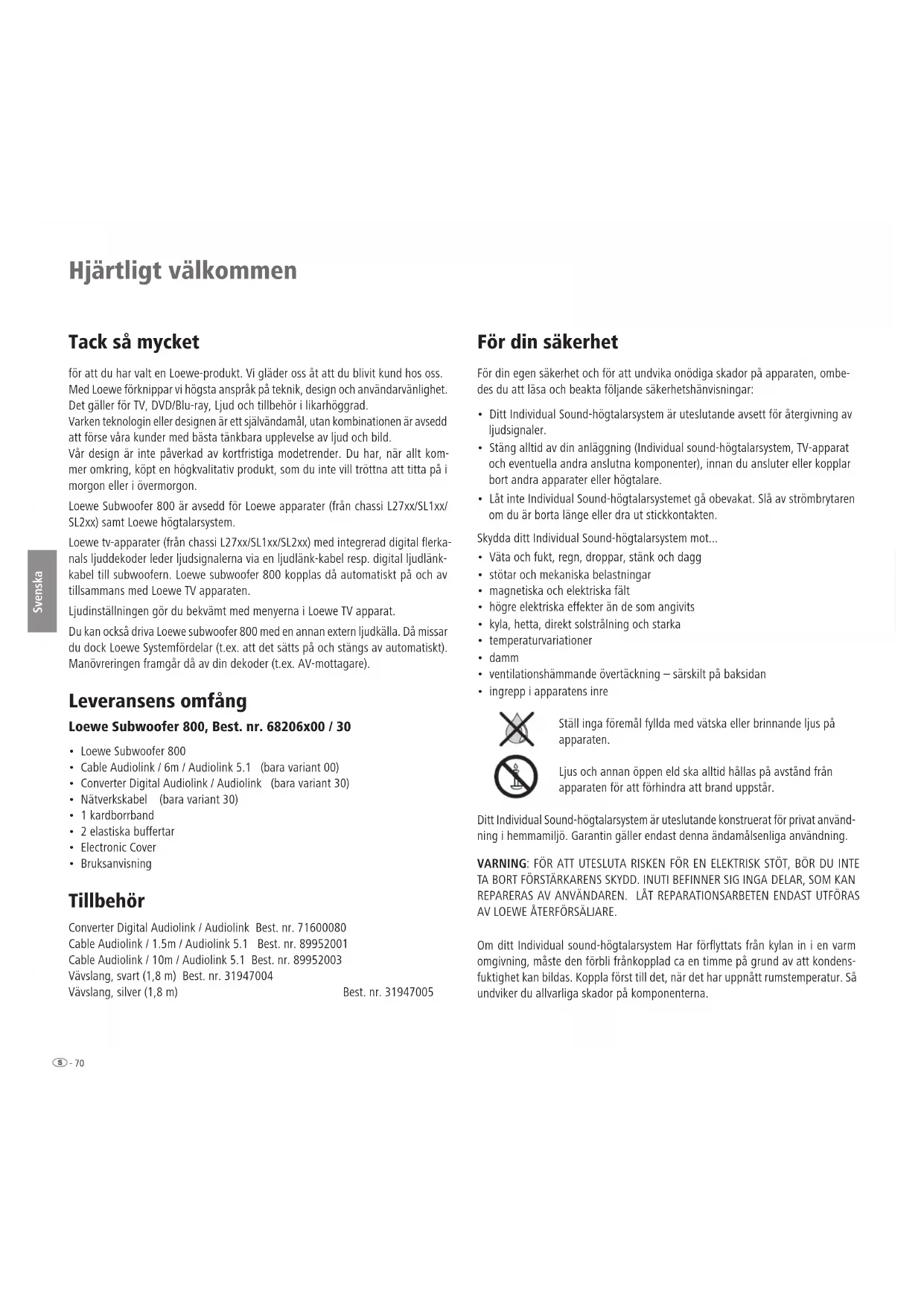 - Bruksanvisning Tillbehör Converter Digital Audiolink / Audiolink Best. nr. 71600080 Cable Audiolink / 1.5m / Audiolink 5.1 Best. nr. 89952001 Cable Audiolink / 10m / Audiolink 5.1 Best. nr. 89952003 Vävslang, svart (1,8 m) Best. nr. 31947004 Vävslang, silver (1,8 m) Best. nr. 31947005 För din säkerhet För din egen säkerhet och för att undvika onödiga skador på apparaten, ombe- des du att läsa och beakta följande säkerhetshänvisningar: