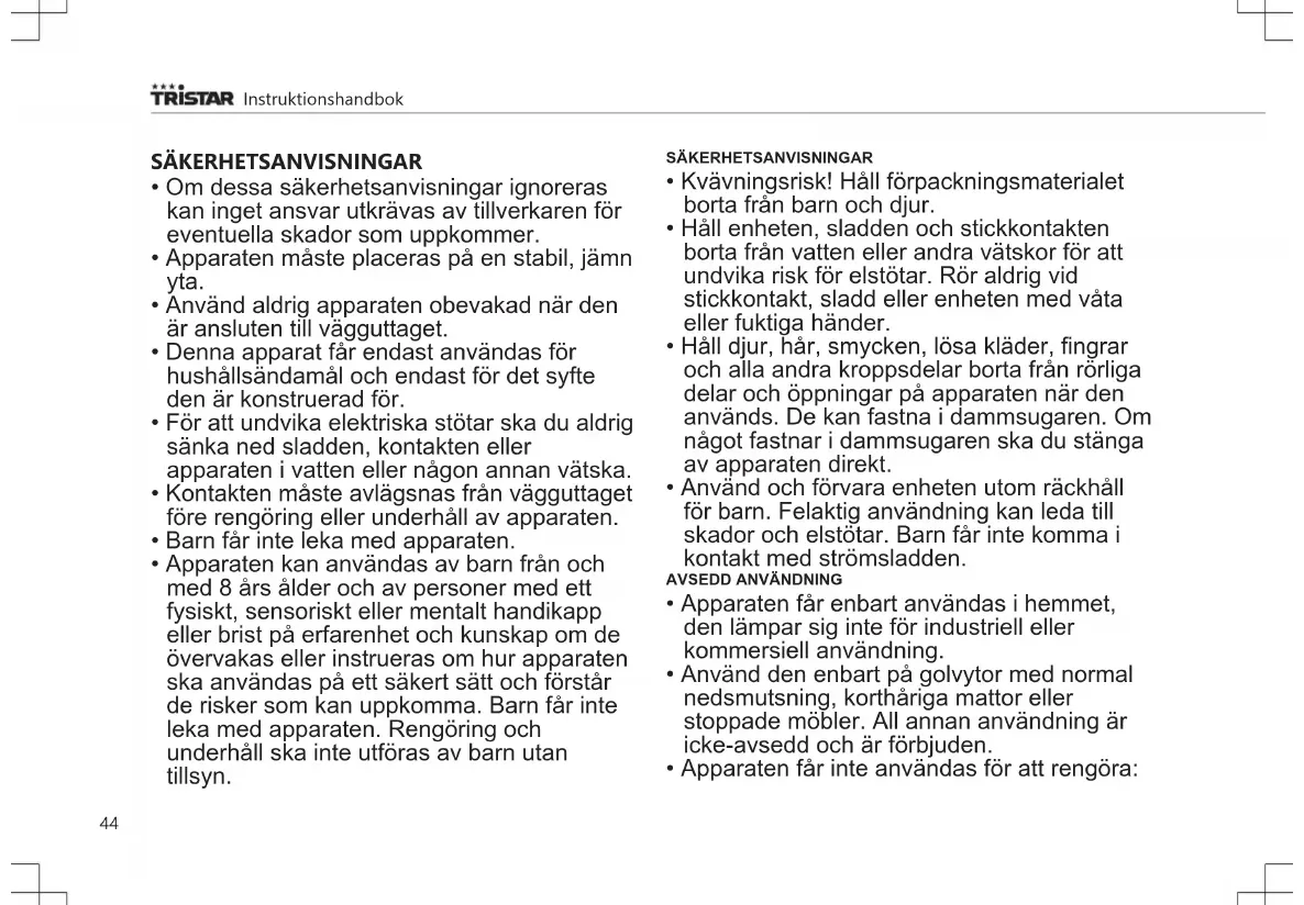 - Apparaten får inte användas för att rengöra:Instruktionshandbok