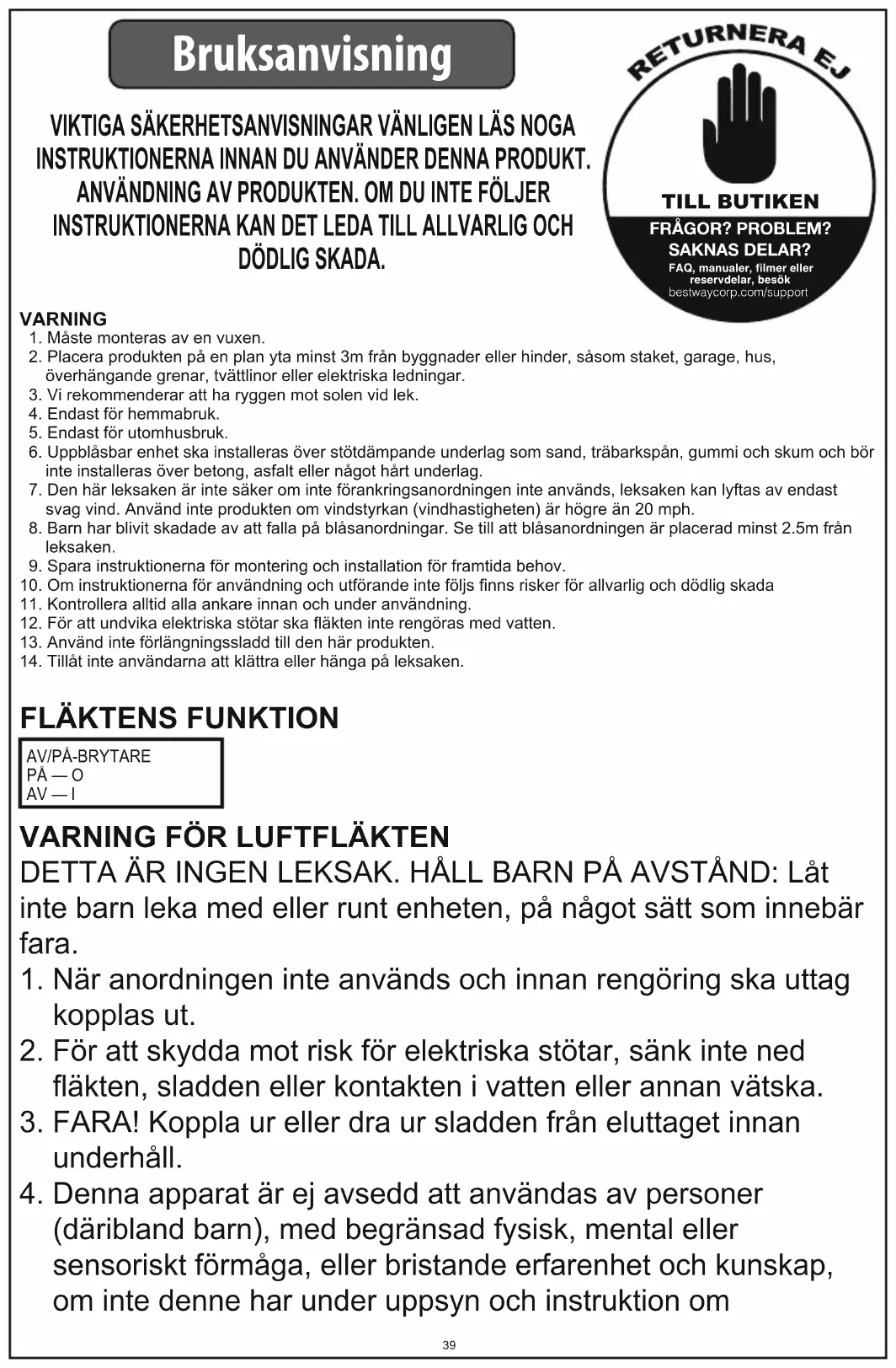 FRÅGOR? PROBLEM?SAKNAS DELAR?FAQ, manualer, filmer eller reservdelar, besök bestwaycorp.com/support TILL BUTIKEN BruksanvisningVARNING FÖR LUFTFLÄKTEN DETTA ÄR INGEN LEKSAK. HÅLL BARN PÅ AVSTÅND: Låt inte barn leka med eller runt enheten, på något sätt som innebär fara.