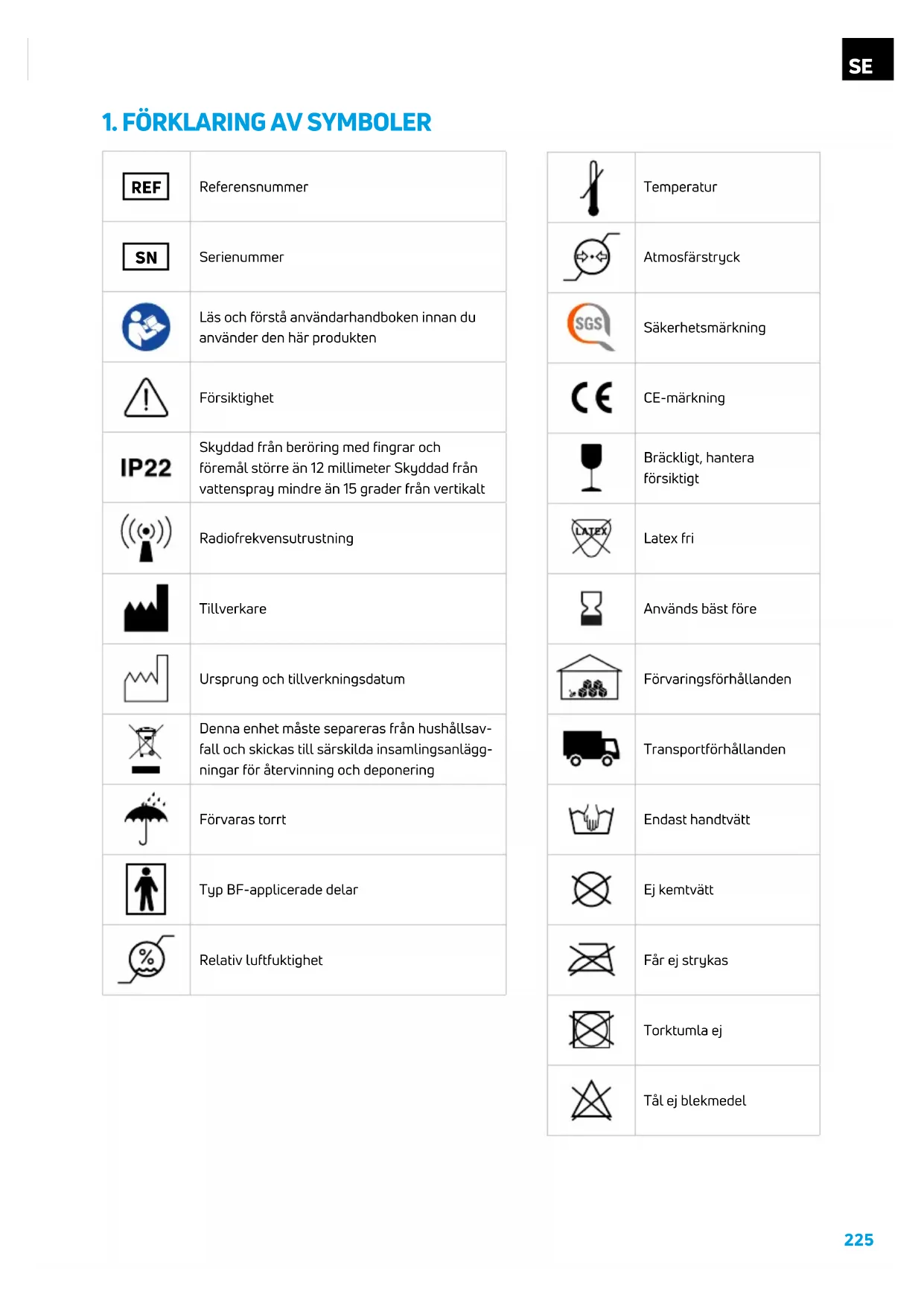 Serienummer Läs och förstå användarhandboken innan du använder den här produkten Försiktighet Skyddad från beröring med fingrar och föremål större än 12 millimeter Skyddad från vattenspray mindre än 15 grader från vertikalt Radiofrekvensutrustning Tillverkare Ursprung och tillverkningsdatum Denna enhet måste separeras från hushållsav- fall och skickas till särskilda insamlingsanlägg- ningar för återvinning och deponering Förvaras torrt Typ BF-applicerade delar Relativ luftfuktighet Temperatur Atmosfärstryck Säkerhetsmärkning CE-märkning Bräckligt, hantera försiktigt Latex fri Används bäst före Förvaringsförhållanden Transportförhållanden Endast handtvätt Ej kemtvätt Får ej strykas Torktumla ej Tål ej blekmedel226