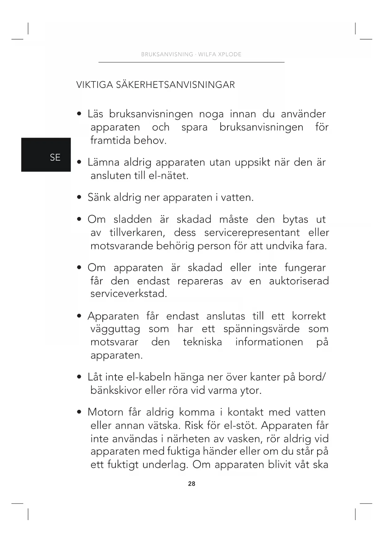 - Motorn får aldrig komma i kontakt med vatten eller annan vätska. Risk för el-stöt. Apparaten får inte användas i närheten av vasken, rör aldrig vid apparaten med fuktiga händer eller om du står på ett fuktigt underlag. Om apparaten blivit våt ska29