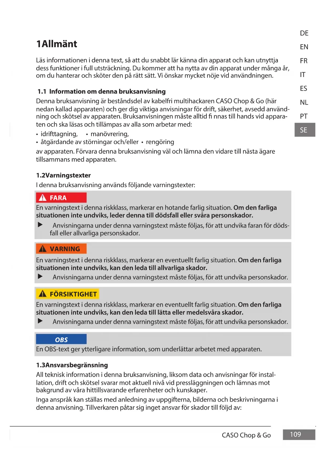 Denna bruksanvisning är beståndsdel av kabelfri multihackaren CASO Chop & Go (här nedan kallad apparaten) och ger dig viktiga anvisningar för drift, säkerhet, avsedd använd- ning och skötsel av apparaten. Bruksanvisningen måste alltid nnas till hands vid appara- ten och ska läsas och tillämpas av alla som arbetar med: