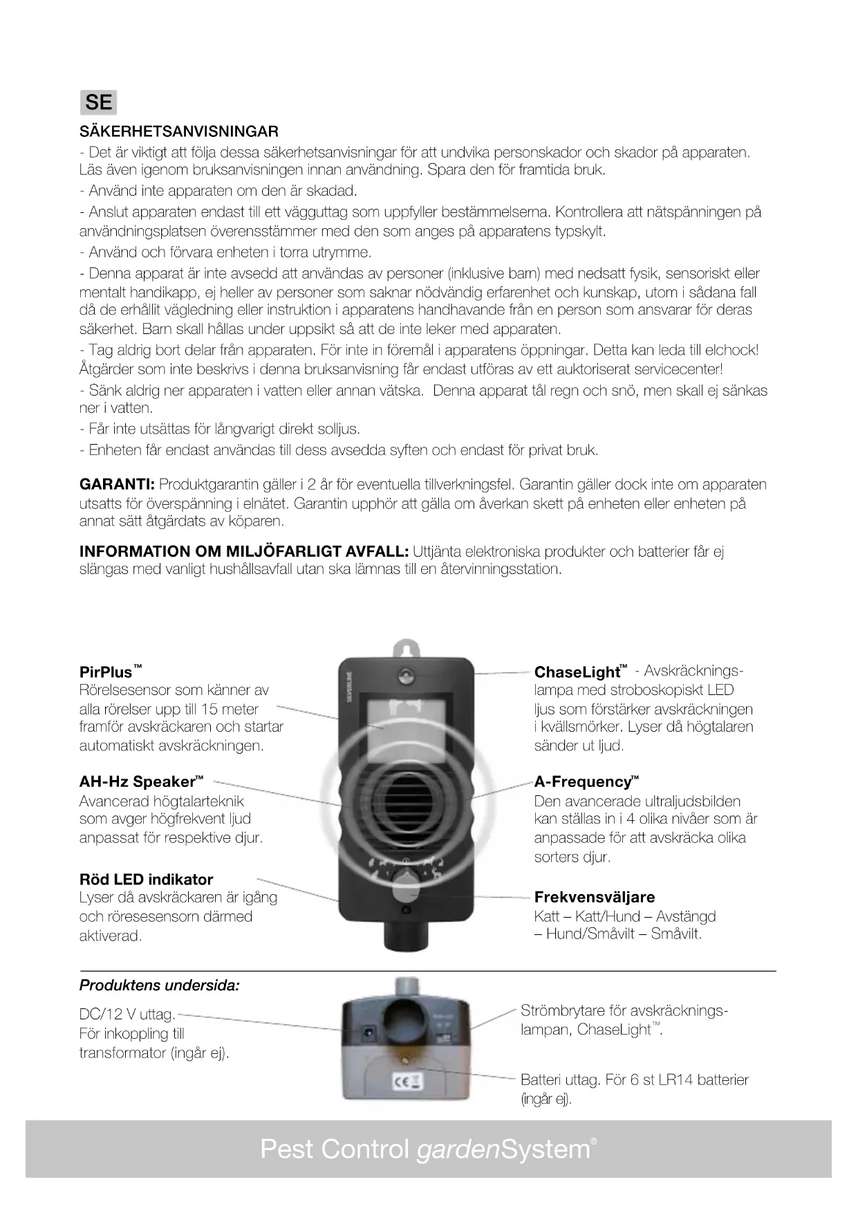 - Undvik att exponera rörelsesensorn för direkt soljus, eftersom livslängden då förkortas.Pest Control gardenSystem