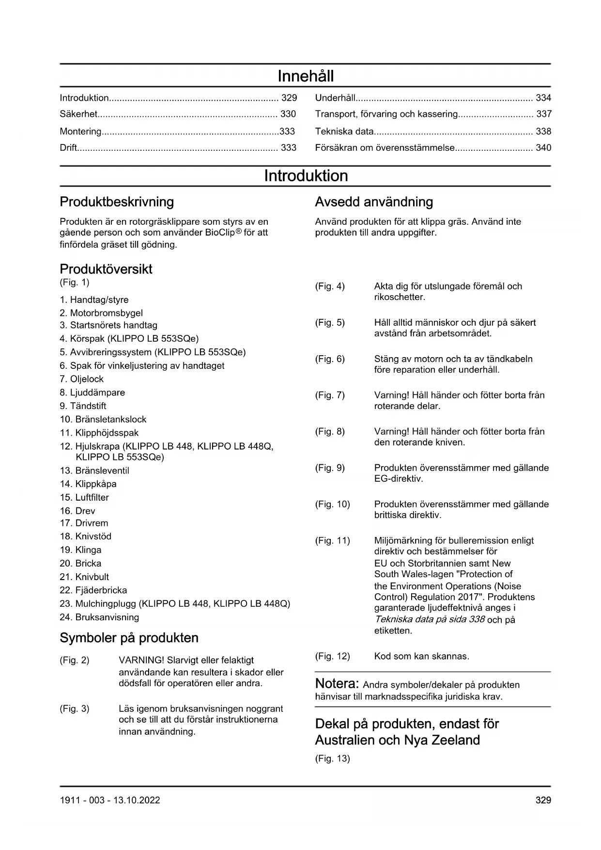 Symboler på produkten (Fig. 2) VARNING! Slarvigt eller felaktigt användande kan resultera i skador eller dödsfall för operatören eller andra. (Fig. 3) Läs igenom bruksanvisningen noggrant och se till att du förstår instruktionerna innan användning. (Fig. 4) Akta dig för utslungade föremål och rikoschetter. (Fig. 5) Håll alltid människor och djur på säkert avstånd från arbetsområdet. (Fig. 6) Stäng av motorn och ta av tändkabeln före reparation eller underhåll. (Fig. 7) Varning! Håll händer och fötter borta från roterande delar. (Fig. 8) Varning! Håll händer och fötter borta från den roterande kniven. (Fig. 9) Produkten överensstämmer med gällande EG-direktiv. (Fig. 10) Produkten överensstämmer med gällande brittiska direktiv. (Fig. 11) Miljömärkning för bulleremission enligt direktiv och bestämmelser för EU och Storbritannien samt New South Wales-lagen "Protection of the Environment Operations (Noise Control) Regulation 2017". Produktens garanterade ljudeffektnivå anges i Tekniska data på sida 338 och på etiketten. (Fig. 12) Kod som kan skannas. Notera: Andra symboler/dekaler på produkten hänvisar till marknadsspecifika juridiska krav. Dekal på produkten, endast för Australien och Nya Zeeland (Fig. 13) 1911 - 003 - 13.10.2022 329Håll händer och fötter borta från den roterande kniven. Euro V-utsläpp VARNING: Manipulering av motorn upphäver EG-typgodkännandet för den här produkten. Produktansvar Enligt lagstiftningen för produktansvar ansvarar vi inte för skador som vår produkt orsakar om: