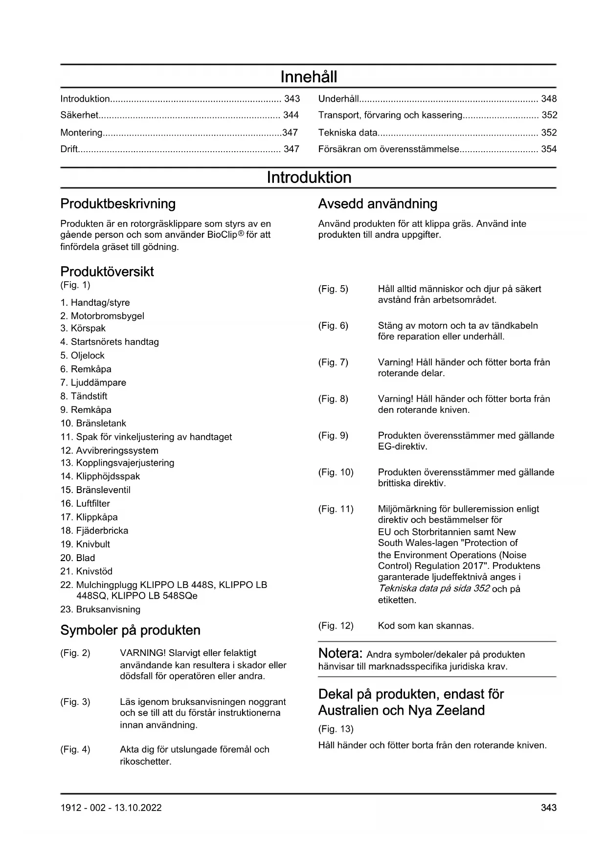 Symboler på produkten (Fig. 2) VARNING! Slarvigt eller felaktigt användande kan resultera i skador eller dödsfall för operatören eller andra. (Fig. 3) Läs igenom bruksanvisningen noggrant och se till att du förstår instruktionerna innan användning. (Fig. 4) Akta dig för utslungade föremål och rikoschetter. (Fig. 5) Håll alltid människor och djur på säkert avstånd från arbetsområdet. (Fig. 6) Stäng av motorn och ta av tändkabeln före reparation eller underhåll. (Fig. 7) Varning! Håll händer och fötter borta från roterande delar. (Fig. 8) Varning! Håll händer och fötter borta från den roterande kniven. (Fig. 9) Produkten överensstämmer med gällande EG-direktiv. (Fig. 10) Produkten överensstämmer med gällande brittiska direktiv. (Fig. 11) Miljömärkning för bulleremission enligt direktiv och bestämmelser för EU och Storbritannien samt New South Wales-lagen "Protection of the Environment Operations (Noise Control) Regulation 2017". Produktens garanterade ljudeffektnivå anges i Tekniska data på sida 352 och på etiketten. (Fig. 12) Kod som kan skannas. Notera: Andra symboler/dekaler på produkten hänvisar till marknadsspecifika juridiska krav. Dekal på produkten, endast för Australien och Nya Zeeland (Fig. 13) Håll händer och fötter borta från den roterande kniven. 1912 - 002 - 13.10.2022 343Euro V-utsläpp VARNING: Manipulering av motorn upphäver EG-typgodkännandet för den här produkten. Produktansvar Enligt lagstiftningen för produktansvar ansvarar vi inte för skador som vår produkt orsakar om: