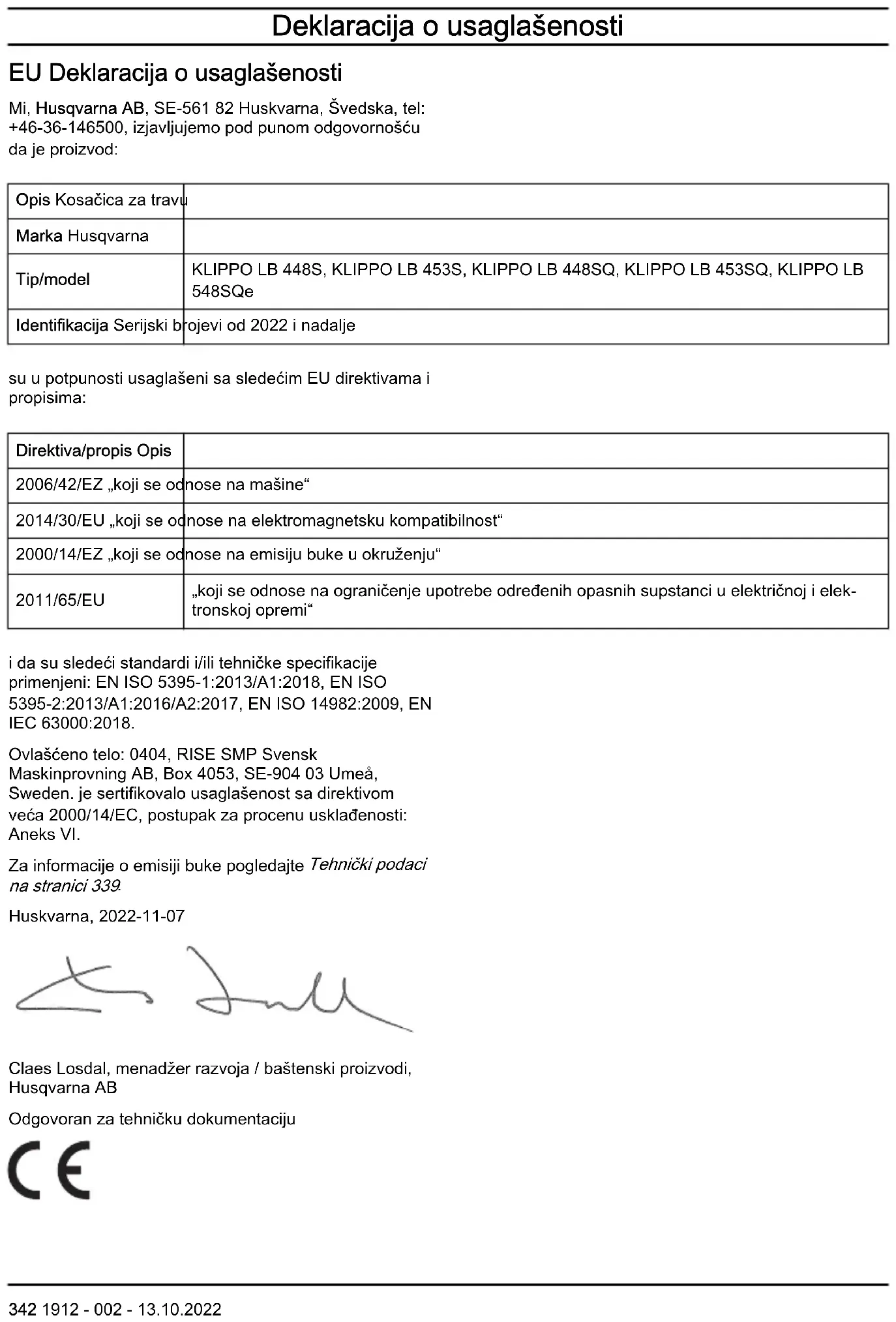 1912 - 002 - 13.10.2022 353Försäkran om överensstämmelse EU-försäkran om överensstämmelse Vi, Husqvarna AB, 561 82 Huskvarna, Sverige, tel: +46-36-146500, försäkrar på eget ansvar att produkten: Beskrivning Gräsklippare Varumärke Husqvarna Typ/Modell KLIPPO LB 448S, KLIPPO LB 453S, KLIPPO LB 448SQ, KLIPPO LB 453SQ, KLIPPO LB 548SQe Identifiering Serienummer daterade 2022 och framåt uppfyller alla krav i följande EU-direktiv och förordningar: Direktiv/förordning Beskrivning 2006/42/EG ”om maskiner” 2014/30/EU ”angående elektromagnetisk kompatibilitet” 2000/14/EC ”angående emission av buller till omgivningen” 2011/65/EU ”angående begränsning av användning av vissa farliga ämnen i elektrisk och elektronisk utrustning” och att följande standarder och/eller tekniska specifikationer tillämpas: EN ISO 5395-1:2013/A1:2018, EN ISO 5395-2:2013/A1:2016/A2:2017, EN ISO 14982:2009, EN IEC 63000:2018. Anmält organ: 0404, RISE SMP Svensk Maskinprovning AB, Box 4053, SE-904 03 Umeå, Sweden. har intygat överensstämmelse med rådets direktiv 2000/14/EG, procedur för utvärdering av överensstämmelse: bilaga VI. För information om bulleremissioner, se Tekniska data på sida 352
