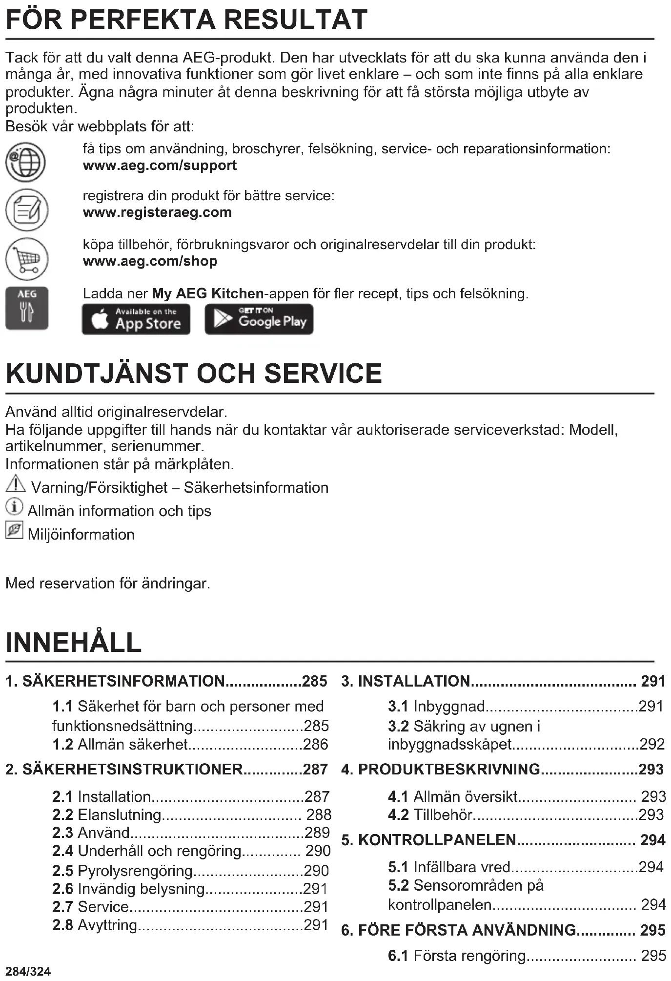 Tack för att du valt denna AEG-produkt. Den har utvecklats för att du ska kunna använda den i många år, med innovativa funktioner som gör livet enklare – och som inte finns på alla enklare produkter. Ägna några minuter åt denna beskrivning för att få största möjliga utbyte av produkten. Besök vår webbplats för att: få tips om användning, broschyrer, felsökning, service- och reparationsinformation: www.aeg.com/support registrera din produkt för bättre service: www.registeraeg.com köpa tillbehör, förbrukningsvaror och originalreservdelar till din produkt: www.aeg.com/shop Ladda ner My AEG Kitchen-appen för fler recept, tips och felsökning.