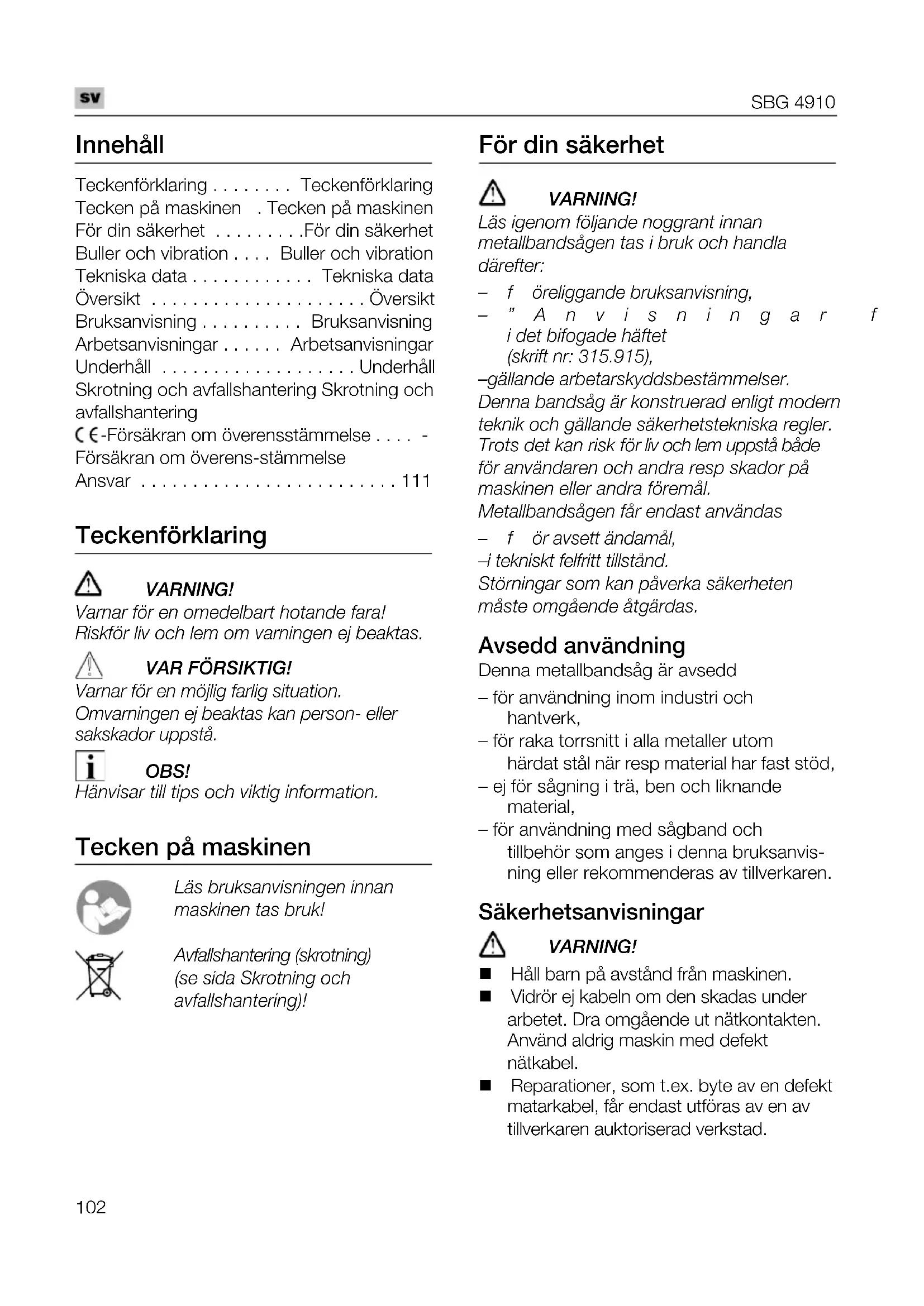 Innehåll Teckenförklaring . . . . . . . . Teckenförklaring Tecken på maskinen . Tecken på maskinen För din säkerhet . . . . . . . . .För din säkerhet Buller och vibration . . . . Buller och vibration Tekniska data . . . . . . . . . . . . Tekniska data Översikt . . . . . . . . . . . . . . . . . . . . . Översikt Bruksanvisning . . . . . . . . . . Bruksanvisning Arbetsanvisningar . . . . . . Arbetsanvisningar Underhåll . . . . . . . . . . . . . . . . . . . Underhåll Skrotning och avfallshantering Skrotning och avfallshantering -Försäkran om överensstämmelse . . . . - Försäkran om överens-stämmelse Ansvar . . . . . . . . . . . . . . . . . . . . . . . . . 111 Teckenförklaring s^okfkd> s~êå~ê=Ñ∏ê=Éå=çãÉÇÉäÄ~êí=Üçí~åÇÉ=Ñ~ê~>= oáëâ Ñ∏ê=äáî=çÅÜ=äÉã=çã=î~êåáåÖÉå=Éà=ÄÉ~âí~ëK s^o=c£opfhqfd> s~êå~ê=Ñ∏ê=Éå=ã∏àäáÖ=Ñ~êäáÖ=ëáíì~íáçåK= lã î~êåáåÖÉå=Éà=ÄÉ~âí~ë=â~å=éÉêëçåJ=ÉääÉê= ë~âëâ~Ççê=ìééëí™K l_p> e®åîáë~ê=íáää=íáéë=çÅÜ=îáâíáÖ=áåÑçêã~íáçåK Tecken på maskinen i®ë=Äêìâë~åîáëåáåÖÉå=áåå~å= ã~ëâáåÉå=í~ë=Äêìâ> ^îÑ~ääëÜ~åíÉêáåÖ=EëâêçíåáåÖF========== EëÉ=ëáÇ~=pâêçíåáåÖ=çÅÜ= ~îÑ~ääëÜ~åíÉêáåÖF> För din säkerhet s^okfkd> i®ë=áÖÉåçã=Ñ∏äà~åÇÉ=åçÖÖê~åí=áåå~å= ãÉí~ääÄ~åÇë™ÖÉå=í~ë=á=Äêìâ=çÅÜ=Ü~åÇä~= Ç®êÉÑíÉêW ÓÑ∏êÉäáÖÖ~åÇÉ=Äêìâë~åîáëåáåÖI ÓÒ^åîáëåáåÖ~ê=Ñ∏ê=Ü~åíÉêáåÖ=ãÉÇ=ÉäîÉêâíóÖÒ= á=ÇÉí=ÄáÑçÖ~ÇÉ=Ü®ÑíÉí= EëâêáÑí=åêW=PNRKVNRFI Ó Ö®ää~åÇÉ=~êÄÉí~êëâóÇÇëÄÉëí®ããÉäëÉêK aÉåå~=Ä~åÇë™Ö=®ê=âçåëíêìÉê~Ç=ÉåäáÖí=ãçÇÉêå= íÉâåáâ=çÅÜ=Ö®ää~åÇÉ=ë®âÉêÜÉíëíÉâåáëâ~=êÉÖäÉêK= qêçíë=ÇÉí=â~å=êáëâ=Ñ∏ê=äáî=çÅÜ=äÉã=ìééëí™=Ä™ÇÉ= Ñ∏ê=~åî®åÇ~êÉå=çÅÜ=~åÇê~=êÉëé=ëâ~Ççê=é™= ã~ëâáåÉå=ÉääÉê=~åÇê~=Ñ∏êÉã™äK= jÉí~ääÄ~åÇë™ÖÉå=Ñ™ê=ÉåÇ~ëí=~åî®åÇ~ë ÓÑ∏ê=~îëÉíí=®åÇ~ã™äI Ó á=íÉâåáëâí=ÑÉäÑêáíí=íáääëí™åÇK pí∏êåáåÖ~ê=ëçã=â~å=é™îÉêâ~=ë®âÉêÜÉíÉå= ã™ëíÉ=çãÖ™ÉåÇÉ=™íÖ®êÇ~ëK Avsedd användning Denna metallbandsåg är avsedd – för användning inom industri och hantverk, – för raka torrsnitt i alla metaller utom härdat stål när resp material har fast stöd, – ej för sågning i trä, ben och liknande material, – för användning med sågband och tillbehör som anges i denna bruksanvis- ning eller rekommenderas av tillverkaren. Säkerhetsanvisningar s^okfkd> Håll barn på avstånd från maskinen. Vidrör ej kabeln om den skadas under arbetet. Dra omgående ut nätkontakten. Använd aldrig maskin med defekt nätkabel. Reparationer, som t.ex. byte av en defekt matarkabel, får endast utföras av en av tillverkaren auktoriserad verkstad.SBG 4910