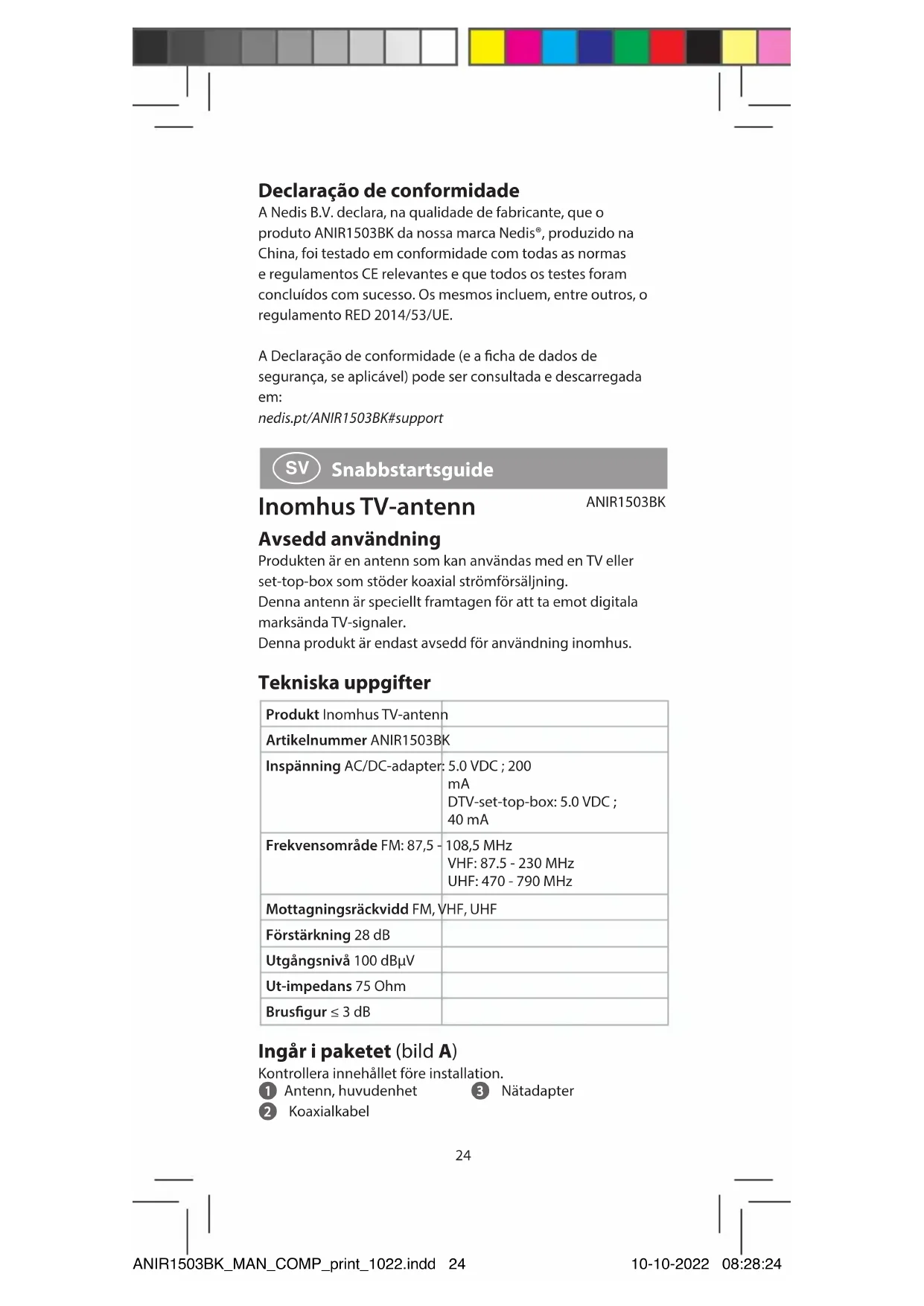 din TV-apparat. Välj ett program och justera sedan antennen tills du hittar läget med den bästa mottagningen. Bortskaning Denna symbol anger att denna produkt inte får kastas tillsammans med hushållssopor inom EG. För att förhindra möjlig skada på miljön eller människors hälsa vid icke kontrollerad bortskaning av avfall bär du ansvar för att återvinna den så att den kan befrämja hållbar återvinning av råmaterial. För att returnera din uttjänta produkt kan du använda det normala returnerings- och insamlingssystemen eller kontakta butiken där produkten inköpets. De kan återvinna denna produkt för miljön. Försäkran om överensstämmelse Vi, Nedis B.V., försäkrar som tillverkare att produkten ANIR1503BK från vårt varumärke Nedis®, tillverkad i Kina, har testats i enlighet med alla relevanta CE-standarder och föreskrifter och att alla tester genomförts med godkänt resultat. Detta inkluderar, men är inte begränsat till, radioutrustningsdirektivet 2014/53/EU. Den fullständiga försäkran om överensstämmelse (och säkerhetsdatabladet, om tillämpligt) kan läsas och laddas ned från: nedis.se/ANIR1503BK#support ANIR1503BK_MAN_COMP_print_1022.indd 26ANIR1503BK_MAN_COMP_print_1022.indd 26 10-10-2022 08:28:2410-10-2022 08:28:2427