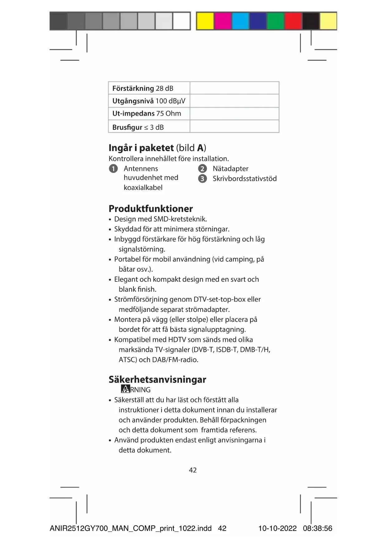 Snabbstartsguide Inomhus TV-antenn ANIR2512GY700 Avsedd användning Produkten är en antenn som kan användas med en TV eller set-top-box som stöder koaxial strömförsäljning. Denna antenn är speciellt framtagen för att ta emot digitala marksända TV-signaler. Denna produkt är endast avsedd för användning inomhus. Tekniska uppgifter Produkt Inomhus TV-antenn Artikelnummer ANIR2512GY700 Inspänning AC/DC-adapter: 12 VDC ; 200 mA DTV-set-top-box: 5.0 VDC ; 40 mA Frekvensområde VHF: 87.5 - 230 MHz UHF: 470 - 694 MHz Inkopplingsplint IEC-kontakt ANIR2512GY700_MAN_COMP_print_1022.indd 41ANIR2512GY700_MAN_COMP_print_1022.indd 41 10-10-2022 08:38:5610-10-2022 08:38:5642 Förstärkning 28 dB Utgångsnivå 100 dBµV Ut-impedans 75 Ohm Brusgur ≤ 3 dB Ingår i paketet (bild A) Kontrollera innehållet före installation. 1 Antennens huvudenhet med koaxialkabel 2 Nätadapter 3 Skrivbordsstativstöd Produktfunktioner