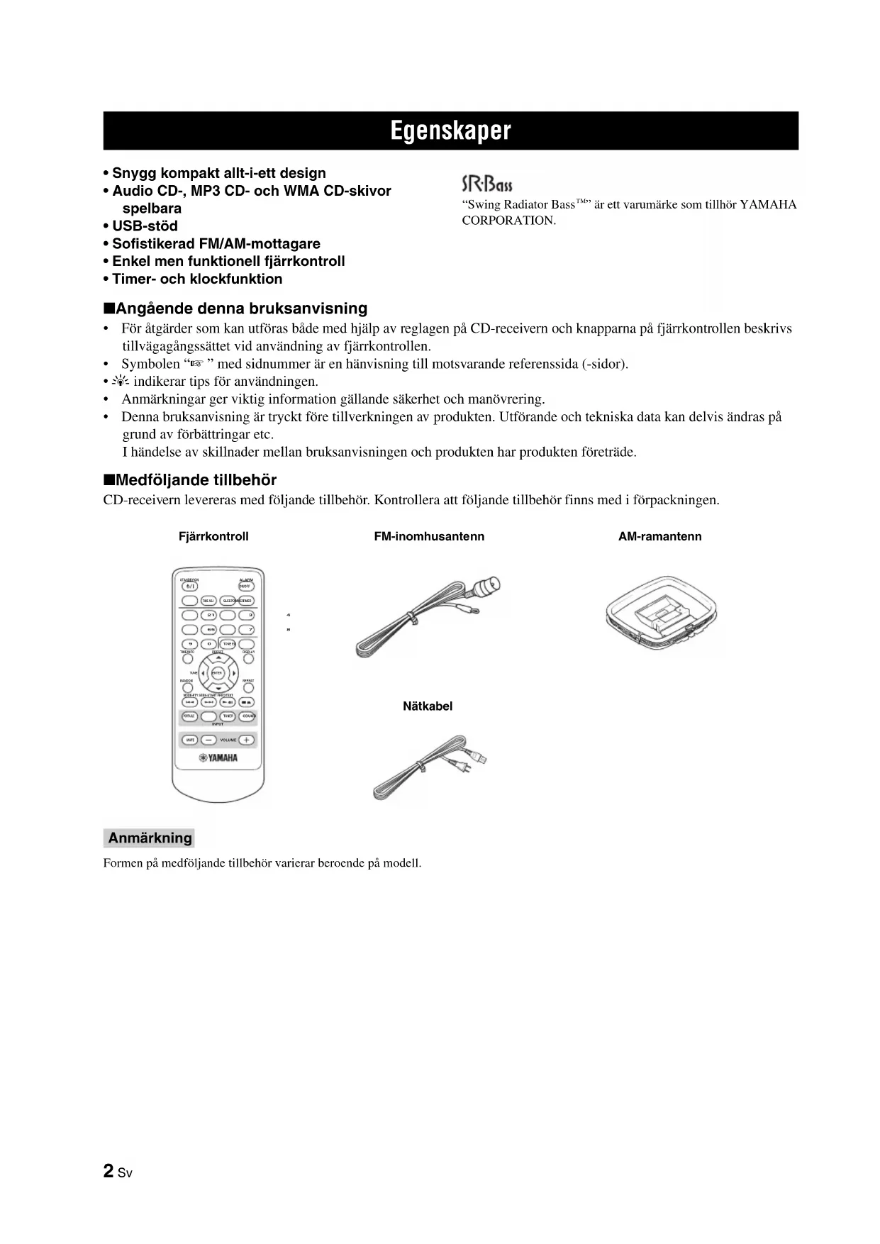- Denna bruksanvisning är tryckt före tillverkningen av produkten. Utförande och tekniska data kan delvis ändras på grund av förbättringar etc. I händelse av skillnader mellan bruksanvisningen och produkten har produkten företräde. ■ Medföljande tillbehör CD-receivern levereras med följande tillbehör. Kontrollera att följande tillbehör finns med i förpackningen. Formen på medföljande tillbehör varierar beroende på modell. Egenskaper Anmärkning