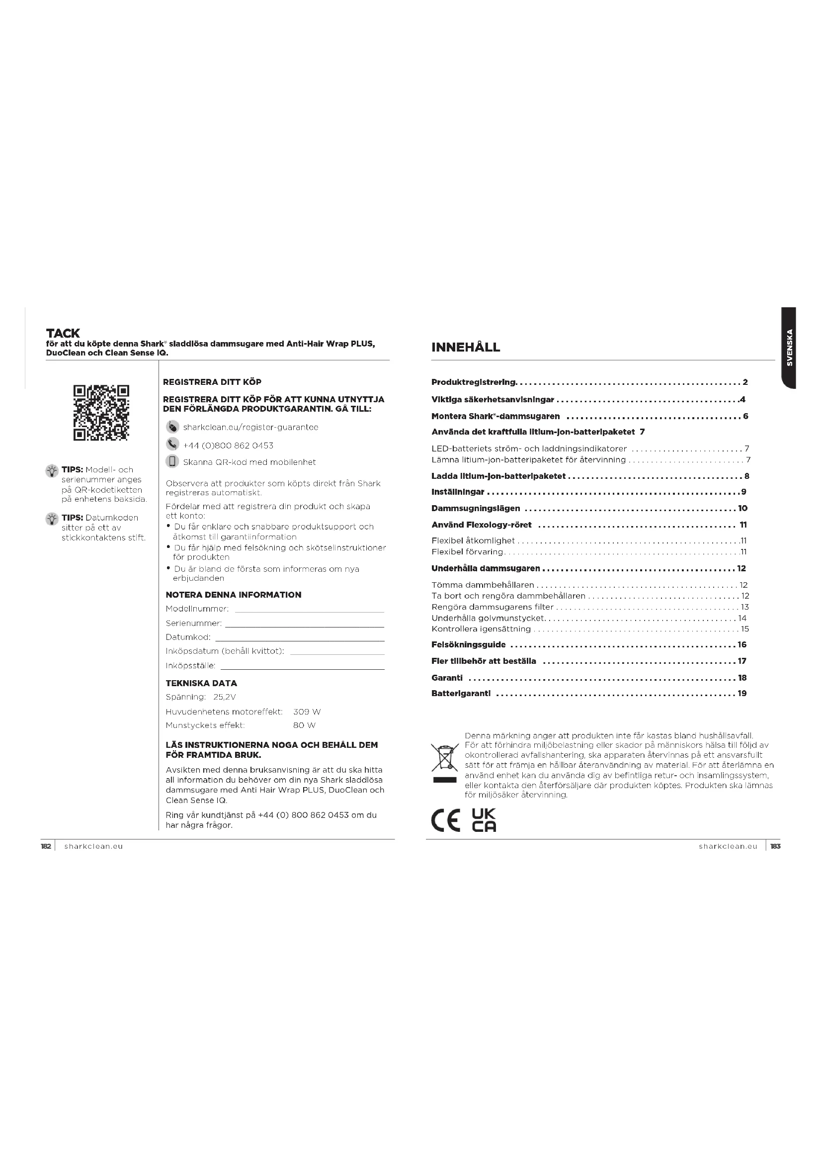 REGISTRERA DITT KÖP FÖR ATT KUNNA UTNYTTJA DEN FÖRLÄNGDA PRODUKTGARANTIN. GÅ TILL: sharkclean.eu/register-guarantee +44 (0)800 862 0453 Skanna QR-kod med mobilenhet TACK för att du köpte denna Shark® sladdlösa dammsugare med Anti-Hair Wrap PLUS, DuoClean och Clean Sense IQ. LÄS INSTRUKTIONERNA NOGA OCH BEHÅLL DEM FÖR FRAMTIDA BRUK. Avsikten med denna bruksanvisning är att du ska hitta all information du behöver om din nya Shark sladdlösa dammsugare med Anti Hair Wrap PLUS, DuoClean och Clean Sense IQ Ring vår kundtjänst på +44 (0) 800 862 0453 om du har några frågor Fördelar med att registrera din produkt och skapa ett konto: