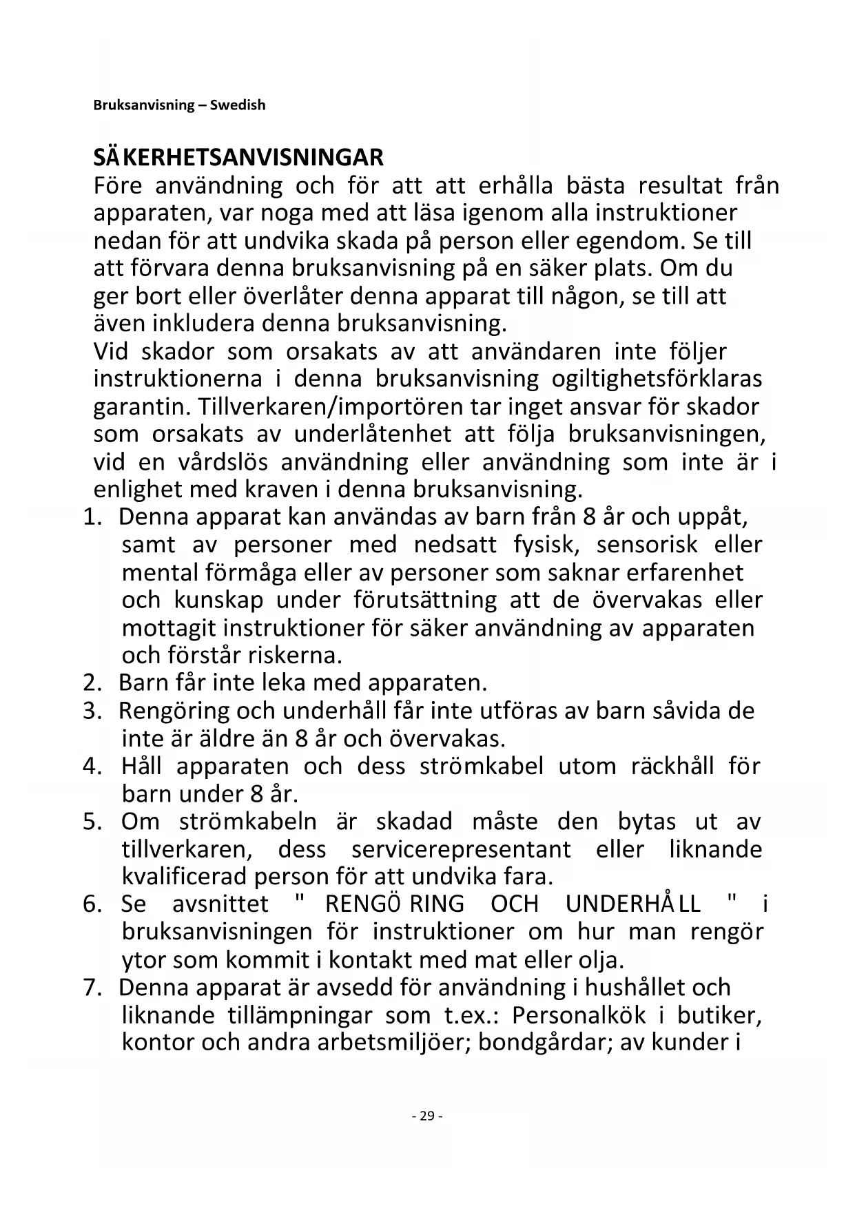 7. Denna apparat är avsedd för användning i hushållet och