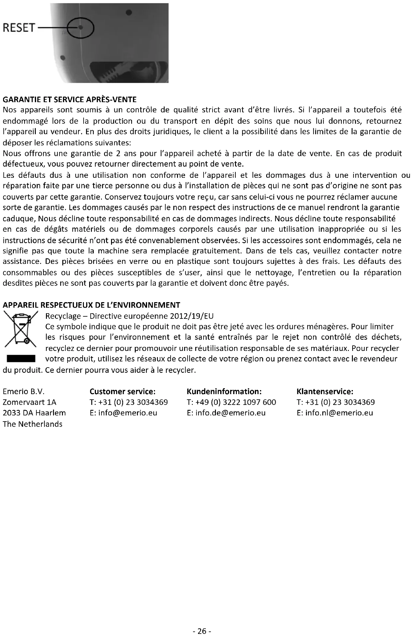 Recyclage – Directive européenne 2012/19/EU Ce symbole indique que le produit ne doit pas être jeté avec les ordures ménagères. Pour limiter les risques pour l’environnement et la santé entraînés par le rejet non contrôlé des déchets, recyclez ce dernier pour promouvoir une réutilisation responsable de ses matériaux. Pour recycler votre produit, utilisez les réseaux de collecte de votre région ou prenez contact avec le revendeur du produit. Ce dernier pourra vous aider à le recycler. Emerio B.V. Customer service: Kundeninformation: Klantenservice: Zomervaart 1A T: +31 (0) 23 3034369 T: +49 (0) 3222 1097 600 T: +31 (0) 23 3034369 2033 DA Haarlem E: info@emerio.eu E: info.de@emerio.eu E: info.nl@emerio.eu The Netherlands- 27 - Bruksanvisning – Swedish SÄKERHETSANVISNINGAR Före användning och för att att erhålla bästa resultat från apparaten, var noga med att läsa igenom alla instruktioner nedan för att undvika skada på person eller egendom. Se till att förvara denna bruksanvisning på en säker plats. Om du ger bort eller överlåter denna apparat till någon, se till att även inkludera denna bruksanvisning. Vid skador som orsakats av att användaren inte följer instruktionerna i denna bruksanvisning ogiltighetsförklaras garantin. Tillverkaren/importören tar inget ansvar för skador som orsakats av underlåtenhet att följa bruksanvisningen, vid en vårdslös användning eller användning som inte är i enlighet med kraven i denna bruksanvisning.