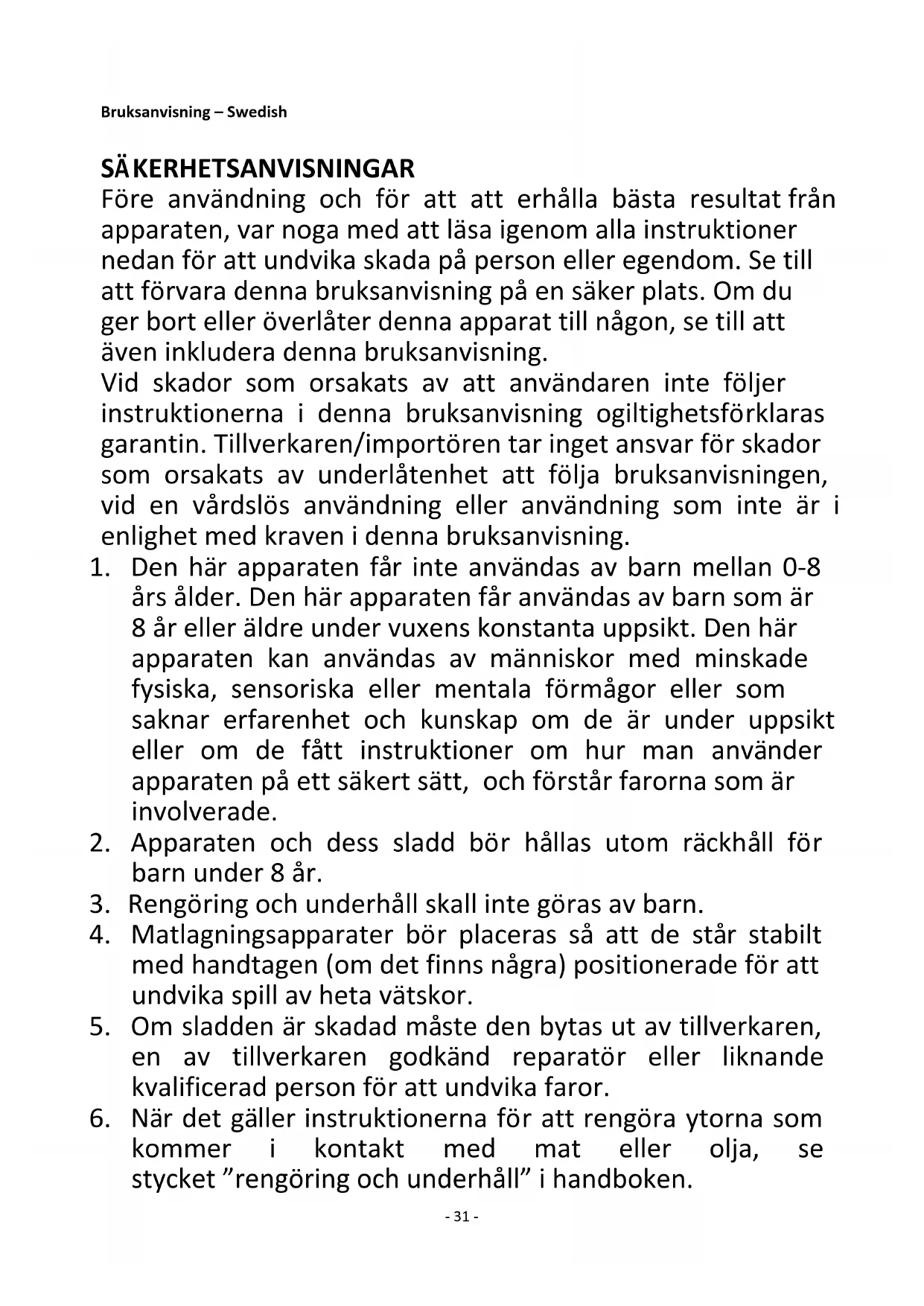 1. Den här apparaten får inte användas av barn mellan 0-8