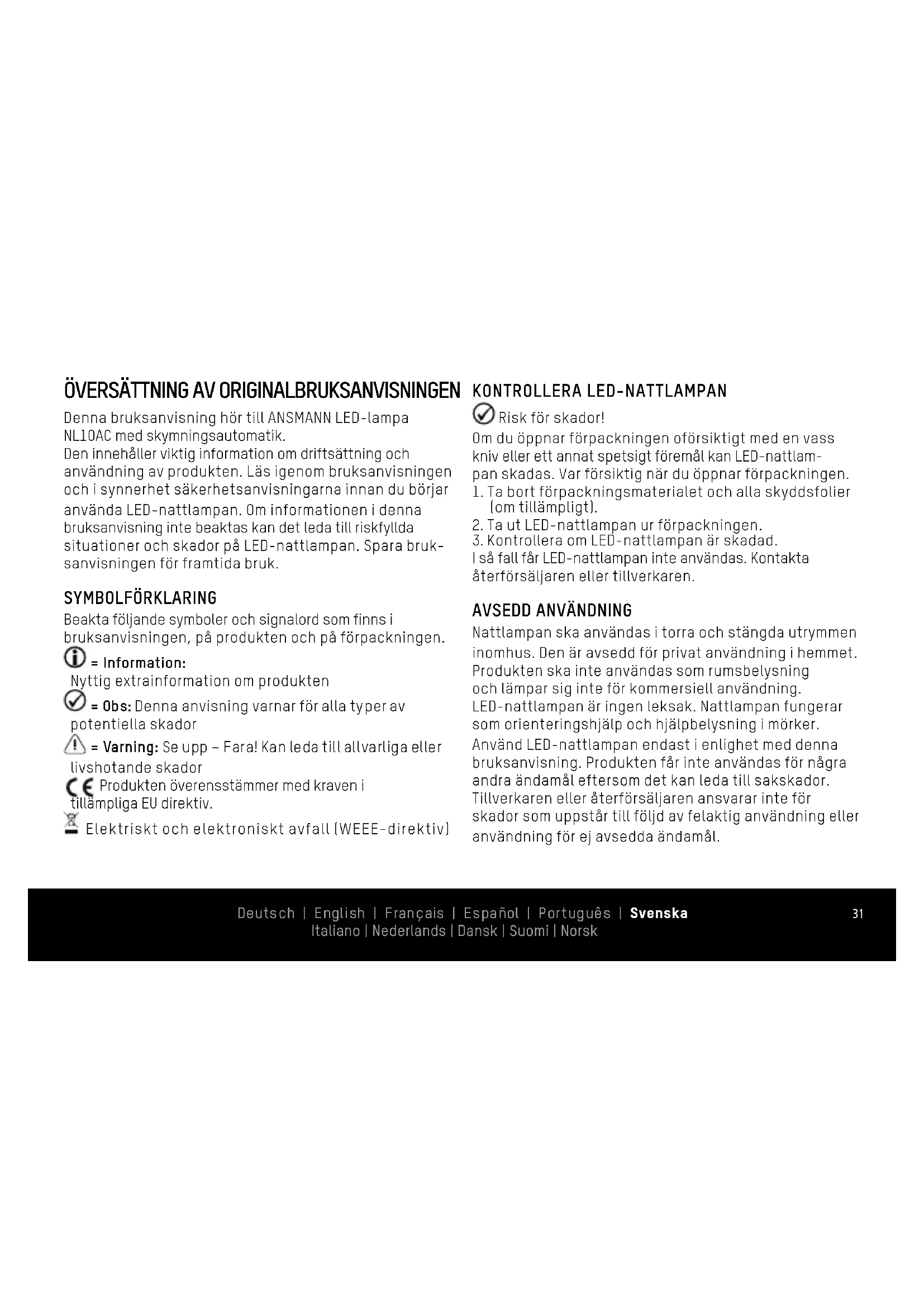 Denna bruksanvisning hör till ANSMANN LED-lampa NL10AC med skymningsautomatik. Den innehåller viktig information om driftsättning och användning av produkten. Läs igenom bruksanvisningen och i synnerhet säkerhetsanvisningarna innan du börjar använda LED-nattlampan. Om informationen i denna bruksanvisning inte beaktas kan det leda till riskfyllda situationer och skador på LED-nattlampan. Spara bruk- sanvisningen för framtida bruk. SYMBOLFÖRKLARING Beakta följande symboler och signalord som finns i bruksanvisningen, på produkten och på förpackningen. = Information: Nyttig extrainformation om produkten = Obs: Denna anvisning varnar för alla typer av potentiella skador = Varning: Se upp – Fara! Kan leda till allvarliga eller livshotande skador Produkten överensstämmer med kraven i tillämpliga EU direktiv. Elektriskt och elektroniskt avfall (WEEE-direktiv) KONTROLLERA LED-NATTLAMPAN Risk för skador! Om du öppnar förpackningen oförsiktigt med en vass kniv eller ett annat spetsigt föremål kan LED-nattlam- pan skadas. Var försiktig när du öppnar förpackningen.