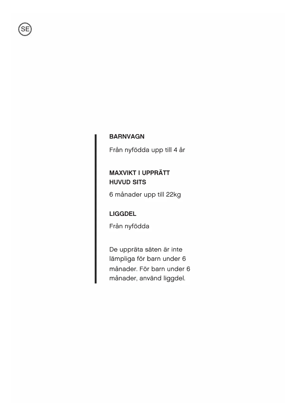 - Denna barnvagn är avsedd från nyfödda upp till 4 år. Använd varierat intervall för huvudsäte: 6 månader upp till 22kg. Använd varierat intervall i liggdel: nyfödda upp till 9kg. Liggdel rekommenderas för nyfödda barn.