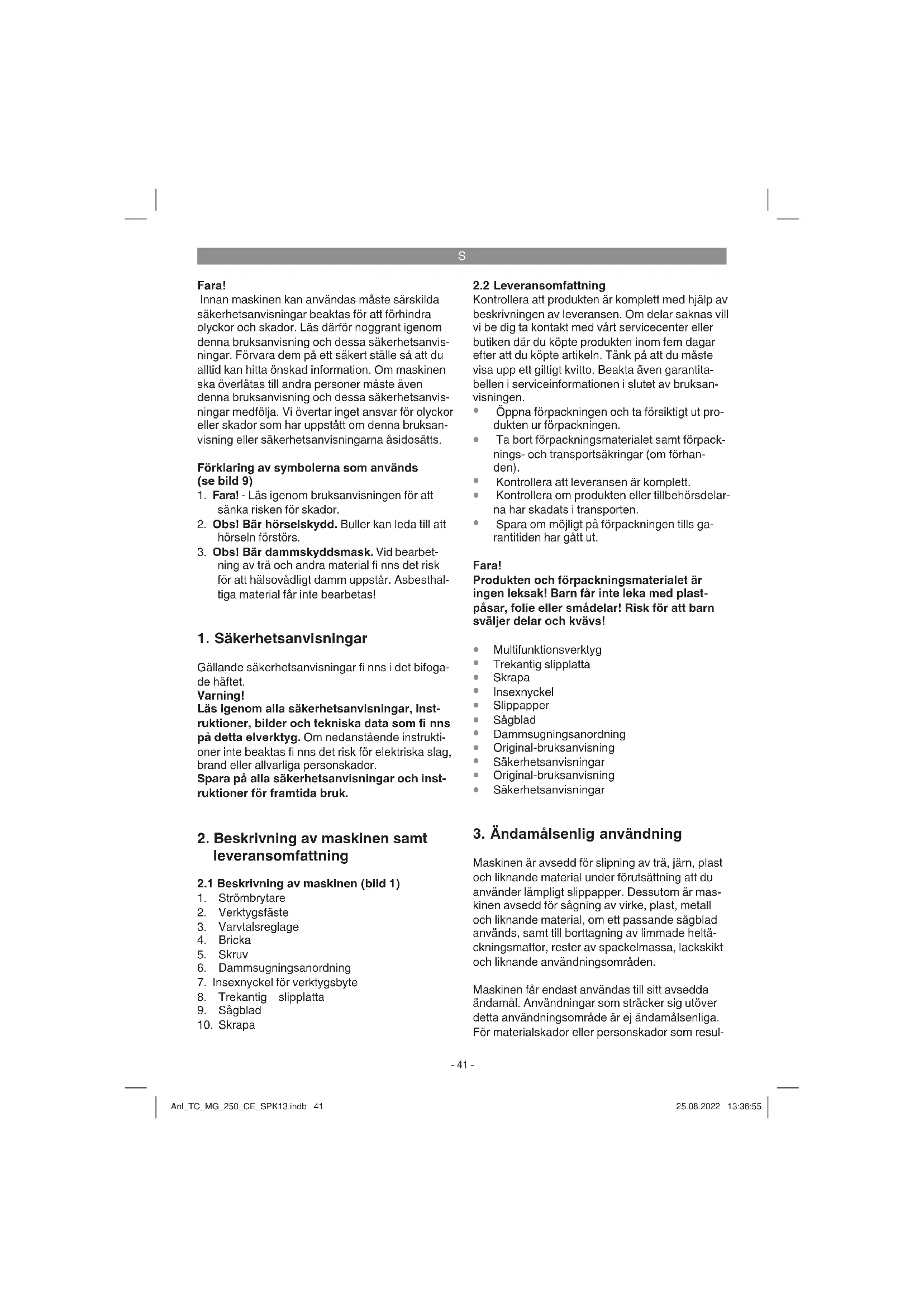 Maskinen är avsedd för slipning av trä, järn, plast och liknande material under förutsättning att du använder lämpligt slippapper. Dessutom är mas- kinen avsedd för sågning av virke, plast, metall och liknande material, om ett passande sågblad används, samt till borttagning av limmade heltä- ckningsmattor, rester av spackelmassa, lackskikt och liknande användningsområden. Maskinen får endast användas till sitt avsedda ändamål. Användningar som sträcker sig utöver detta användningsområde är ej ändamålsenliga. För materialskador eller personskador som resul- Anl_TC_MG_250_CE_SPK13.indb 41Anl_TC_MG_250_CE_SPK13.indb 41 25.08.2022 13:36:5525.08.2022 13:36:55S
