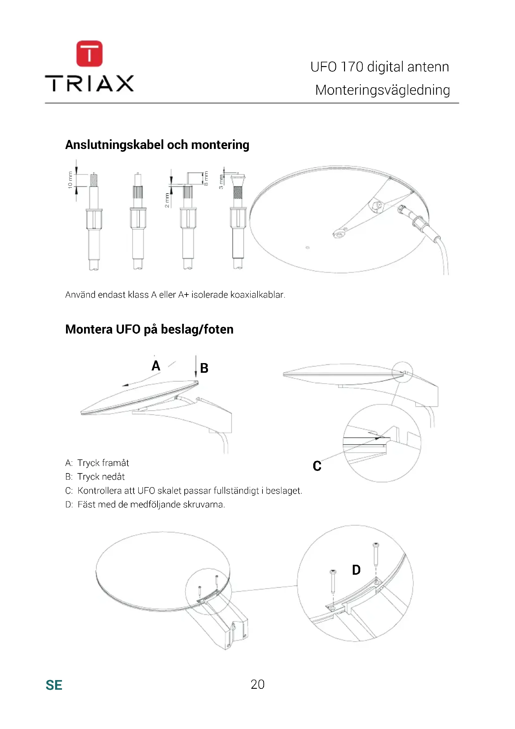 Anslutningskabel och montering 10 mm 2 mm 8 mm 3 mm Montera UFO på beslag/foten A: Tryck framåt B: Tryck nedåt C: Kontrollera att UFO skalet passar fullständigt i beslaget. D: Fäst med de medföljande skruvarna. Använd endast klass A eller A+ isolerade koaxialkablar.