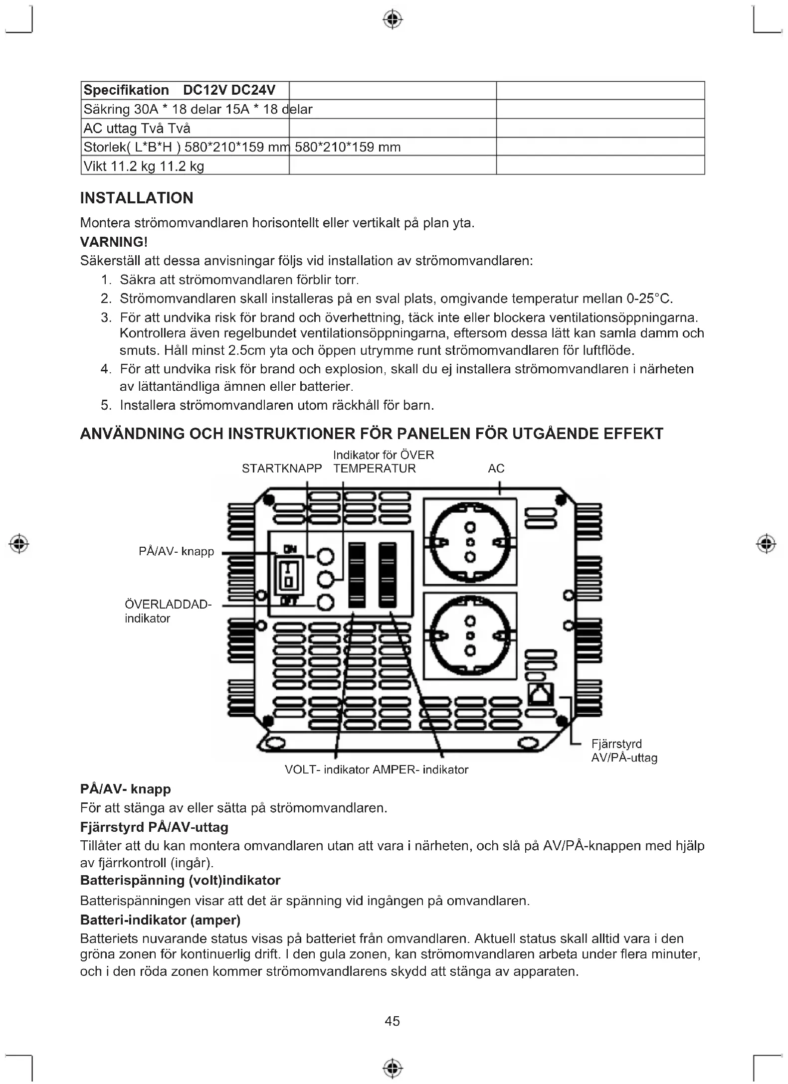 - högsta temperatur45 Specikation DC12V DC24V Säkring 30A * 18 delar 15A * 18 delar AC uttag Två Två Storlek( L*B*H ) 580*210*159 mm 580*210*159 mm Vikt 11.2 kg 11.2 kg INSTALLATION Montera strömomvandlaren horisontellt eller vertikalt på plan yta. VARNING! Säkerställ att dessa anvisningar följs vid installation av strömomvandlaren: