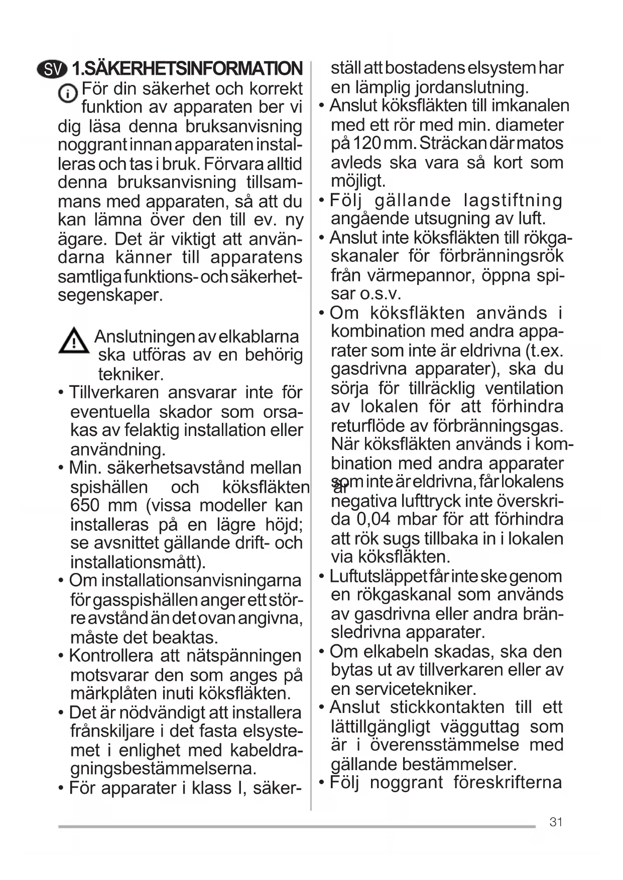 - Per la sostituzione contattare l’Assisten- za Tecnica (“Per l’acquisto rivolgersi all’assistenza tecnica”).31 1.SÄKERHETSINFORMATION För din säkerhet och korrekt funktion av apparaten ber vi dig läsa denna bruksanvisning noggrant innan apparaten instal- leras och tas i bruk. Förvara alltid denna bruksanvisning tillsam- mans med apparaten, så att du kan lämna över den till ev. ny ägare. Det är viktigt att använ- darna känner till apparatens samtliga funktions- och säkerhet- segenskaper. Anslutningen av elkablarna ska utföras av en behörig tekniker.