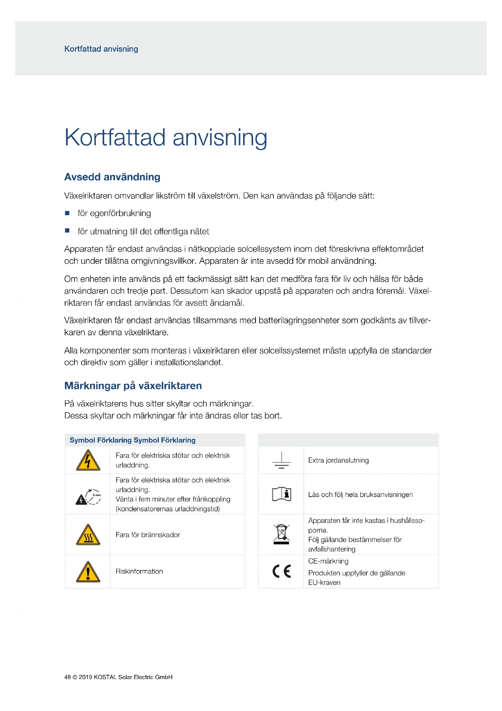 för utmatning till det oentliga nätet Apparaten får endast användas i nätkopplade solcellssystem inom det föreskrivna eektområdet och under tillåtna omgivningsvillkor. Apparaten är inte avsedd för mobil användning. Om enheten inte används på ett fackmässigt sätt kan det medföra fara för liv och hälsa för både användaren och tredje part. Dessutom kan skador uppstå på apparaten och andra föremål. Växel- riktaren får endast användas för avsett ändamål. Växelriktaren får endast användas tillsammans med batterilagringsenheter som godkänts av tillver- karen av denna växelriktare. Alla komponenter som monteras i växelriktaren eller solcellssystemet måste uppfylla de standarder och direktiv som gäller i installationslandet. Märkningar på växelriktaren På växelriktarens hus sitter skyltar och märkningar. Dessa skyltar och märkningar får inte ändras eller tas bort. Symbol Förklaring Symbol Förklaring Fara för elektriska stötar och elektrisk urladdning. Extra jordanslutning 5 min Fara för elektriska stötar och elektrisk urladdning. Vänta i fem minuter efter frånkoppling (kondensatorernas urladdningstid) Läs och följ hela bruksanvisningen 5 min Fara för brännskador Apparaten får inte kastas i hushållsso- porna. Följ gällande bestämmelser för avfallshantering Riskinformation CE-märkning Produkten uppfyller de gällande EU-kraven© 2019 KOSTAL Solar Electric GmbH 49