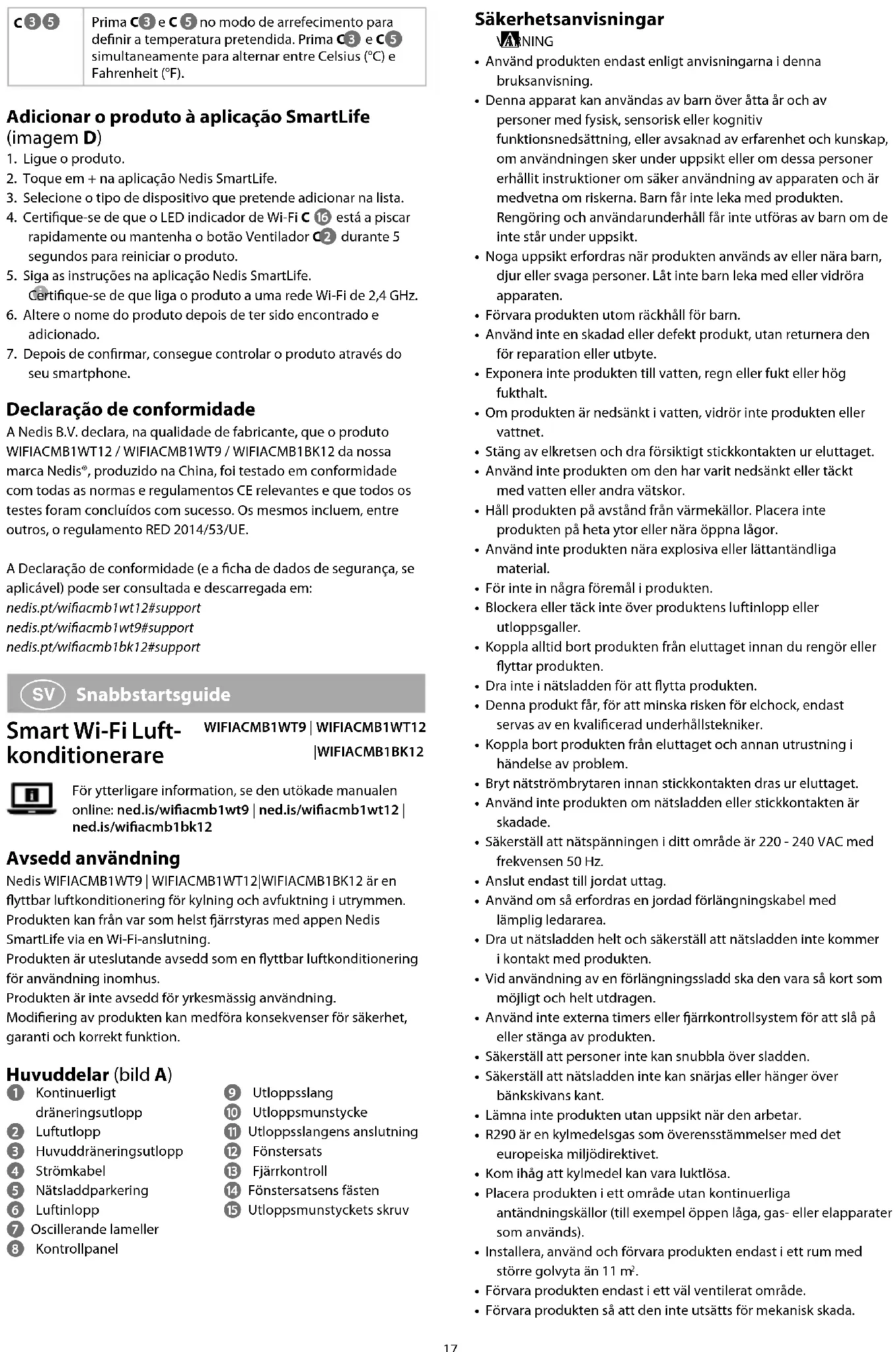 Snabbstartsguide Smart Wi-Fi Luft- konditionerare WIFIACMB1WT9 | WIFIACMB1WT12|WIFIACMB1BK12För ytterligare information, se den utökade manualen online: ned.is/wiacmb1wt9 | ned.is/wiacmb1wt12 | ned.is/wiacmb1bk12 Avsedd användning Nedis WIFIACMB1WT9 | WIFIACMB1WT12|WIFIACMB1BK12 är en yttbar luftkonditionering för kylning och avfuktning i utrymmen.Produkten kan från var som helst ärrstyras med appen Nedis SmartLife via en Wi-Fi-anslutning.Produkten är uteslutande avsedd som en yttbar luftkonditionering för användning inomhus.Produkten är inte avsedd för yrkesmässig användning.Modiering av produkten kan medföra konsekvenser för säkerhet, garanti och korrekt funktion. Huvuddelar (bild A) 1 Kontinuerligt dräneringsutlopp2 Luftutlopp3 Huvuddräneringsutlopp4 Strömkabel5 Nätsladdparkering6 Luftinlopp7 Oscillerande lameller8 Kontrollpanel9 Utloppsslangq Utloppsmunstyckew Utloppsslangens anslutninge Fönstersatsr Fjärrkontrollt Fönstersatsens fästeny Utloppsmunstyckets skruv18