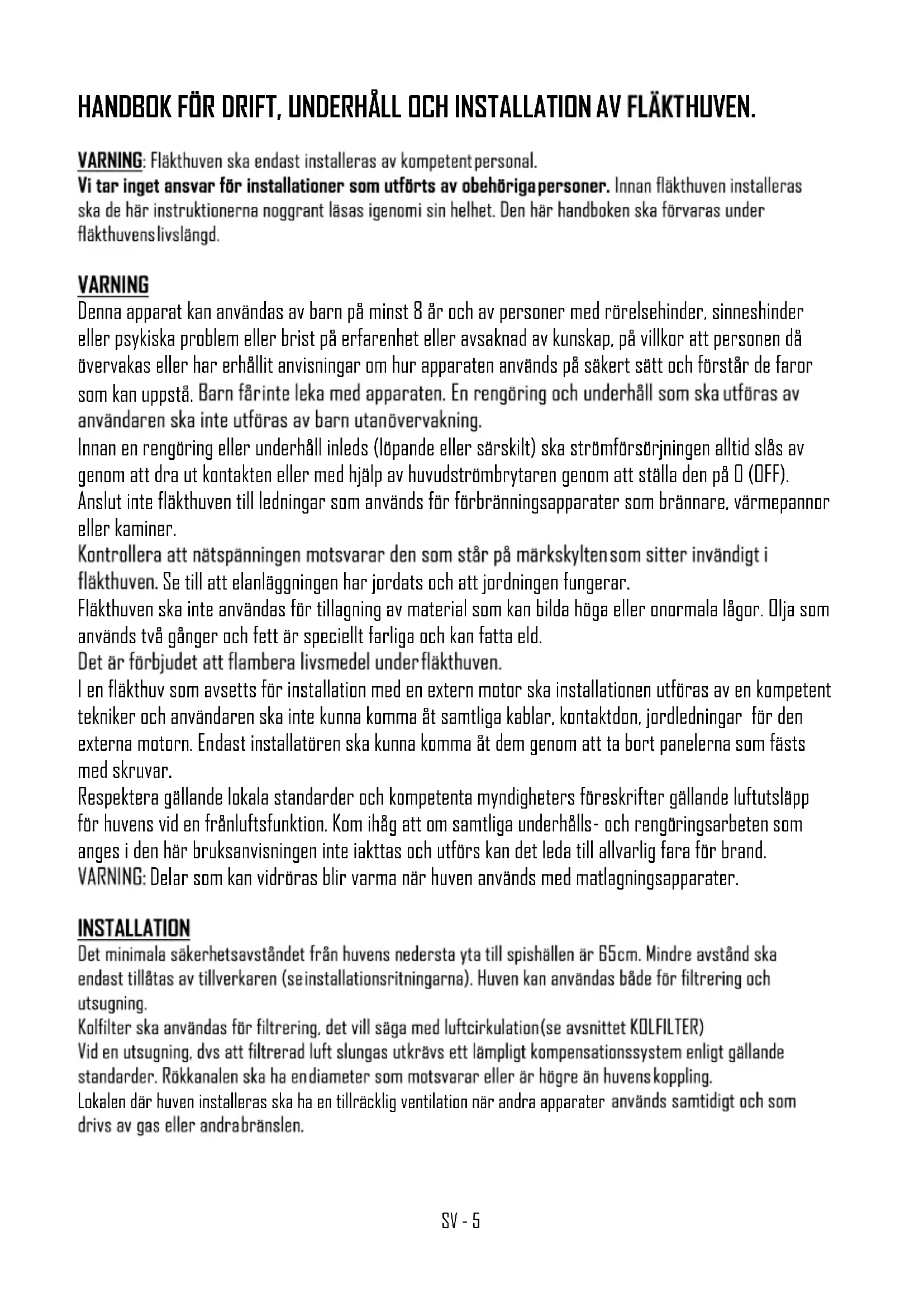 Denna apparat kan användas av barn på minst 8 år och av personer med rörelsehinder, sinneshinder eller psykiska problem eller brist på erfarenhet eller avsaknad av kunskap, på villkor att personen då övervakas eller har erhållit anvisningar om hur apparaten används på säkert sätt och förstår de faror som kan uppstå. Innan en rengöring eller underhåll inleds (löpande eller särskilt) ska strömförsörjningen alltid slås av genom att dra ut kontakten eller med hjälp av huvudströmbrytaren genom att ställa den på 0 (OFF). Anslut inte fläkthuven till ledningar som används för förbränningsapparater som brännare, värmepannor eller kaminer. Se till att elanläggningen har jordats och att jordningen fungerar. Fläkthuven ska inte användas för tillagning av material som kan bilda höga eller onormala lågor. Olja som används två gånger och fett är speciellt farliga och kan fatta eld. I en fläkthuv som avsetts för installation med en extern motor ska installationen utföras av en kompetent tekniker och användaren ska inte kunna komma åt samtliga kablar, kontaktdon, jordledningar för den externa motorn. Endast installatören ska kunna komma åt dem genom att ta bort panelerna som fästs med skruvar. Respektera gällande lokala standarder och kompetenta myndigheters föreskrifter gällande luftutsläpp för huvens vid en frånluftsfunktion. Kom ihåg att om samtliga underhålls- och rengöringsarbeten som anges i den här bruksanvisningen inte iakttas och utförs kan det leda till allvarlig fara för brand. Delar som kan vidröras blir varma när huven används med matlagningsapparater.