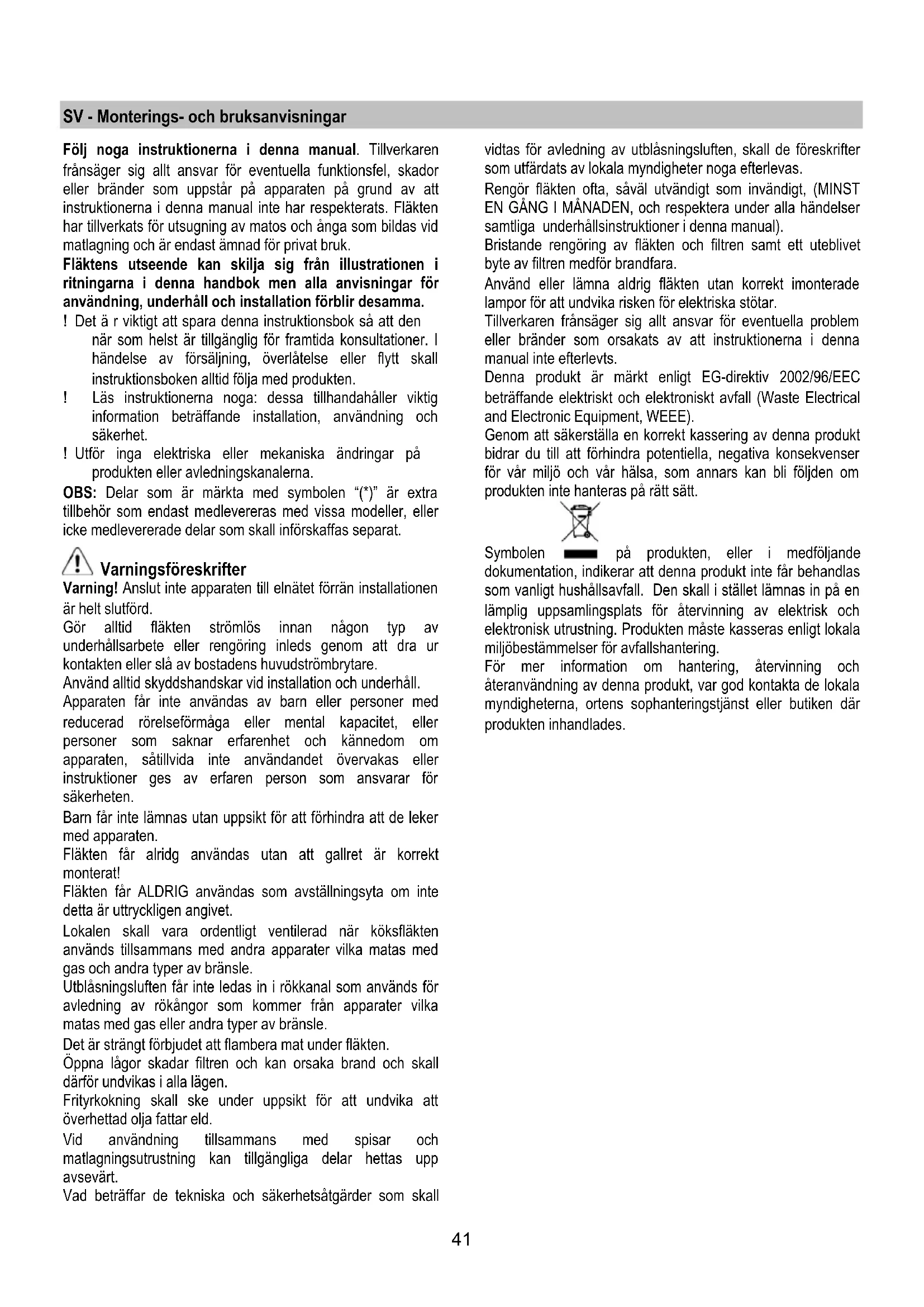 Σε περίπτωση που ο φωτισμός δεν λειτουργήσει, ελέγξτε για την σωστή τοποθέτηση των λαμπών στις θήκες τους πριν καλέσετε την τεχνική βοήθεια.41 SV - Monterings- och bruksanvisningar Följ noga instruktionerna i denna manual. Tillverkaren frånsäger sig allt ansvar för eventuella funktionsfel, skador eller bränder som uppstår på apparaten på grund av att instruktionerna i denna manual inte har respekterats. Fläkten har tillverkats för utsugning av matos och ånga som bildas vid matlagning och är endast ämnad för privat bruk. Fläktens utseende kan skilja sig från illustrationen i ritningarna i denna handbok men alla anvisningar för användning, underhåll och installation förblir desamma. ! Det ä r viktigt att spara denna instruktionsbok så att den när som helst är tillgänglig för framtida konsultationer. I händelse av försäljning, överlåtelse eller flytt skall instruktionsboken alltid följa med produkten. ! Läs instruktionerna noga: dessa tillhandahåller viktig information beträffande installation, användning och säkerhet. ! Utför inga elektriska eller mekaniska ändringar på produkten eller avledningskanalerna. OBS: Delar som är märkta med symbolen “(*)” är extra tillbehör som endast medlevereras med vissa modeller, eller icke medlevererade delar som skall införskaffas separat. Varningsföreskrifter Varning! Anslut inte apparaten till elnätet förrän installationen är helt slutförd. Gör alltid fläkten strömlös innan någon typ av underhållsarbete eller rengöring inleds genom att dra ur kontakten eller slå av bostadens huvudströmbrytare. Använd alltid skyddshandskar vid installation och underhåll. Apparaten får inte användas av barn eller personer med reducerad rörelseförmåga eller mental kapacitet, eller personer som saknar erfarenhet och kännedom om apparaten, såtillvida inte användandet övervakas eller instruktioner ges av erfaren person som ansvarar för säkerheten. Barn får inte lämnas utan uppsikt för att förhindra att de leker med apparaten. Fläkten får alridg användas utan att gallret är korrekt monterat! Fläkten får ALDRIG användas som avställningsyta om inte detta är uttryckligen angivet. Lokalen skall vara ordentligt ventilerad när köksfläkten används tillsammans med andra apparater vilka matas med gas och andra typer av bränsle. Utblåsningsluften får inte ledas in i rökkanal som används för avledning av rökångor som kommer från apparater vilka matas med gas eller andra typer av bränsle. Det är strängt förbjudet att flambera mat under fläkten. Öppna lågor skadar filtren och kan orsaka brand och skall därför undvikas i alla lägen. Frityrkokning skall ske under uppsikt för att undvika att överhettad olja fattar eld. Vid användning tillsammans med spisar och matlagningsutrustning kan tillgängliga delar hettas upp avsevärt. Vad beträffar de tekniska och säkerhetsåtgärder som skall vidtas för avledning av utblåsningsluften, skall de föreskrifter som utfärdats av lokala myndigheter noga efterlevas. Rengör fläkten ofta, såväl utvändigt som invändigt, (MINST EN GÅNG I MÅNADEN, och respektera under alla händelser samtliga underhållsinstruktioner i denna manual). Bristande rengöring av fläkten och filtren samt ett uteblivet byte av filtren medför brandfara. Använd eller lämna aldrig fläkten utan korrekt imonterade lampor för att undvika risken för elektriska stötar. Tillverkaren frånsäger sig allt ansvar för eventuella problem eller bränder som orsakats av att instruktionerna i denna manual inte efterlevts. Denna produkt är märkt enligt EG-direktiv 2002/96/EEC beträffande elektriskt och elektroniskt avfall (Waste Electrical and Electronic Equipment, WEEE). Genom att säkerställa en korrekt kassering av denna produkt bidrar du till att förhindra potentiella, negativa konsekvenser för vår miljö och vår hälsa, som annars kan bli följden om produkten inte hanteras på rätt sätt. Symbolen på produkten, eller i medföljande dokumentation, indikerar att denna produkt inte får behandlas som vanligt hushållsavfall. Den skall i stället lämnas in på en lämplig uppsamlingsplats för återvinning av elektrisk och elektronisk utrustning. Produkten måste kasseras enligt lokala miljöbestämmelser för avfallshantering. För mer information om hantering, återvinning och återanvändning av denna produkt, var god kontakta de lokala myndigheterna, ortens sophanteringstjänst eller butiken där produkten inhandlades.42 Användning Fläkten har tillverkats för att användas som utsugningsversion med utvändig evakuering eller som filterversion med intern återcirkulation. Utsugningsversion Matoset leds ut ur lokalen med hjälp av ett avledningsrör som är fixerat på anslutningsflänsen. Avledningsröret skall ha samma diameter som anslutningsflänsen. Varning! Avledningsröret medlevereras inte och skall införskaffas separat. Röret skall, även när det är horisontellt draget, alltid luta lätt (cirka 10°) uppåt, så att luften lätt kan ledas ut ur lokalen. I det fall fläkten är försedd med kolfilter skall dessa tas ur. Rören och utloppsöppningarna i väggen med vilka fläkten skall anslutas bör ha samma diameter som luftutsläppet (anslutningsflänsen). I det fall man använder rör och utloppsöppningar i väggen med mindre diameter medför detta en lägre utblåsprestanda och en drastisk förhöjning av bullernivån. Vi avsäger oss därför allt ansvar gällande denna typ av problem. ! Använd ett så kort rör som möjligt. ! Röret skall vara så rakt som möjligt (högsta tillåtna vinkel på böjarna 90°). ! Undvik stora skillnader i rörets tvärsnittsarea. ! Använd rör vars insida är så slät som möjligt. ! Röret skall vara tillverkat av i lag godkända material. Filterversion Den utsugna luften avfettas