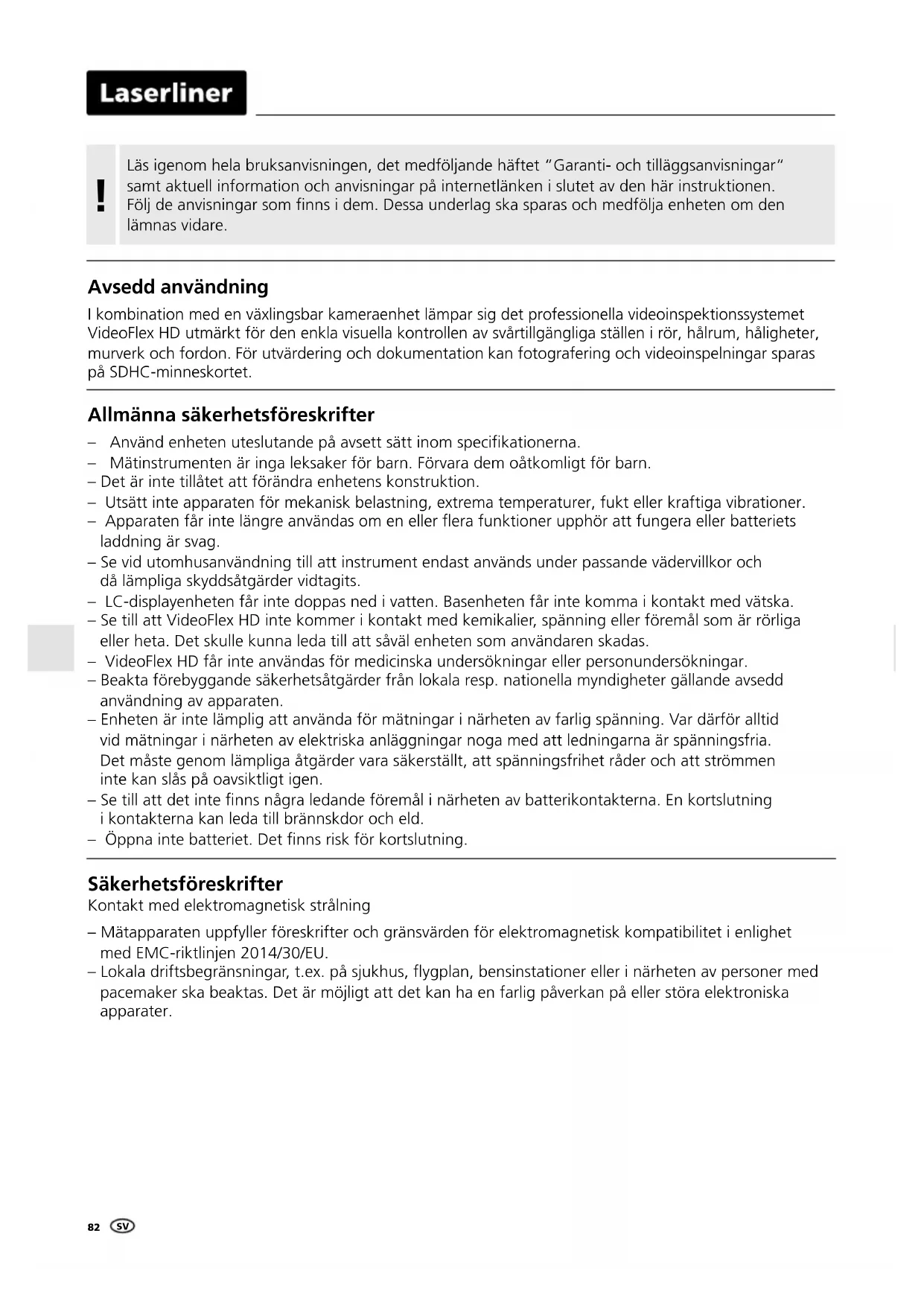 PTSäkerhetsföreskrifter Kontakt med elektromagnetisk strålning – Mätapparaten uppfyller föreskrifter och gränsvärden för elektromagnetisk kompatibilitet i enlighet med EMC-riktlinjen 2014/30/EU. – Lokala driftsbegränsningar, t.ex. på sjukhus, ygplan, bensinstationer eller i närheten av personer med pacemaker ska beaktas. Det är möjligt att det kan ha en farlig påverkan på eller störa elektroniska apparater. Allmänna säkerhetsföreskrifter – Använd enheten uteslutande på avsett sätt inom specikationerna. – Mätinstrumenten är inga leksaker för barn. Förvara dem oåtkomligt för barn. – Det är inte tillåtet att förändra enhetens konstruktion. – Utsätt inte apparaten för mekanisk belastning, extrema temperaturer, fukt eller kraftiga vibrationer. – Apparaten får inte längre användas om en eller era funktioner upphör att fungera eller batteriets laddning är svag. – Se vid utomhusanvändning till att instrument endast används under passande vädervillkor och då lämpliga skyddsåtgärder vidtagits. – LC-displayenheten får inte doppas ned i vatten. Basenheten får inte komma i kontakt med vätska. – Se till att VideoFlex HD inte kommer i kontakt med kemikalier, spänning eller föremål som är rörliga eller heta. Det skulle kunna leda till att såväl enheten som användaren skadas. – VideoFlex HD får inte användas för medicinska undersökningar eller personundersökningar. – Beakta förebyggande säkerhetsåtgärder från lokala resp. nationella myndigheter gällande avsedd användning av apparaten. – Enheten är inte lämplig att använda för mätningar i närheten av farlig spänning. Var därför alltid vid mätningar i närheten av elektriska anläggningar noga med att ledningarna är spänningsfria. Det måste genom lämpliga åtgärder vara säkerställt, att spänningsfrihet råder och att strömmen inte kan slås på oavsiktligt igen. – Se till att det inte nns några ledande föremål i närheten av batterikontakterna. En kortslutning i kontakterna kan leda till brännskdor och eld. – Öppna inte batteriet. Det nns risk för kortslutning. Läs igenom hela bruksanvisningen, det medföljande häftet “Garanti- och tilläggsanvisningar“ samt aktuell information och anvisningar på internetlänken i slutet av den här instruktionen. Följ de anvisningar som finns i dem. Dessa underlag ska sparas och medfölja enheten om den lämnas vidare.