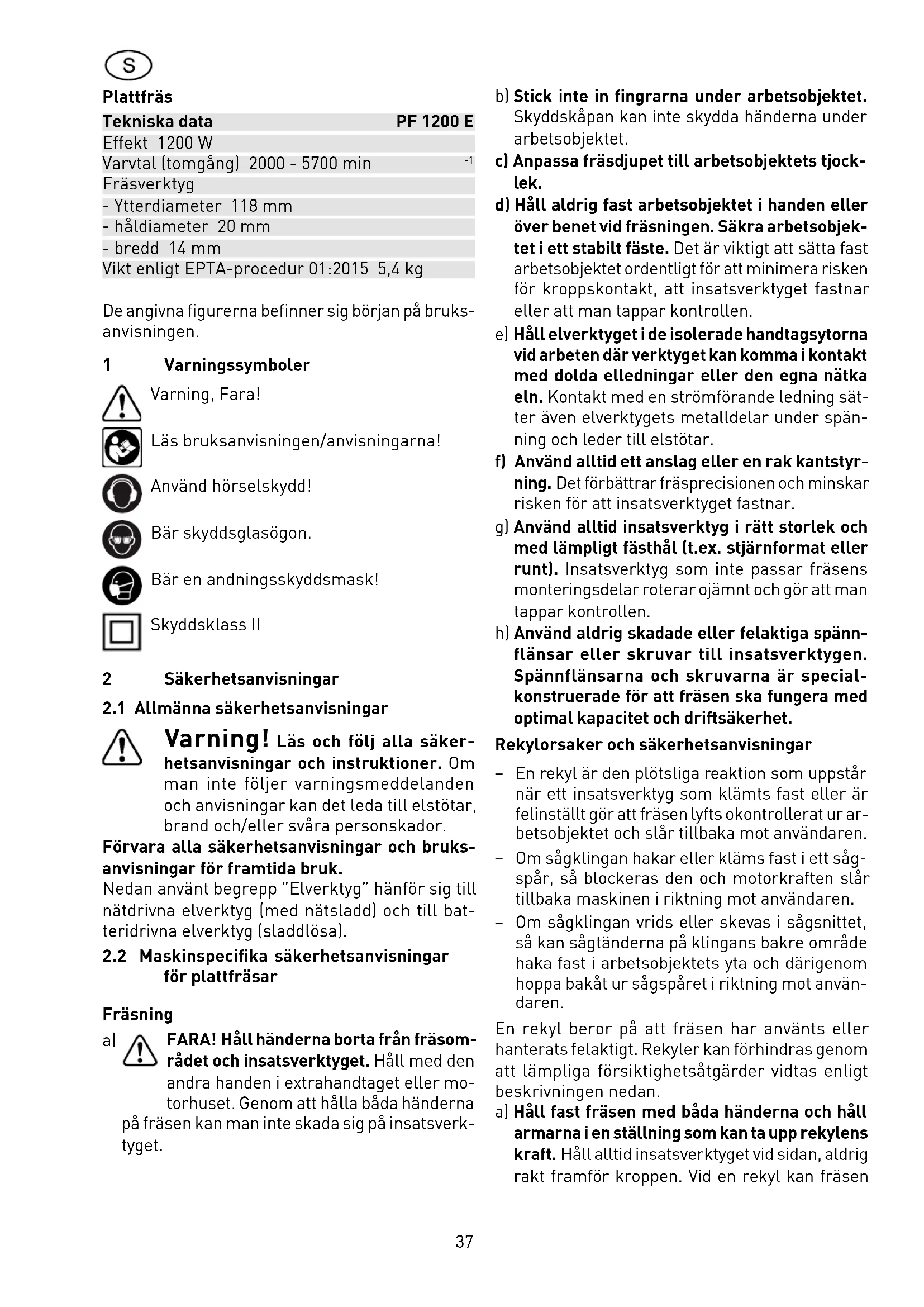 Fräsverktyg - Ytterdiameter 118 mm - håldiameter 20 mm - bredd 14 mm Vikt enligt EPTA-procedur 01:2015 5,4 kg De angivna figurerna befinner sig början på bruks- anvisningen. 1 Varningssymboler Varning, Fara! Läs bruksanvisningen/anvisningarna! Använd hörselskydd! Bär skyddsglasögon. Bär en andningsskyddsmask! Skyddsklass II 2 Säkerhetsanvisningar