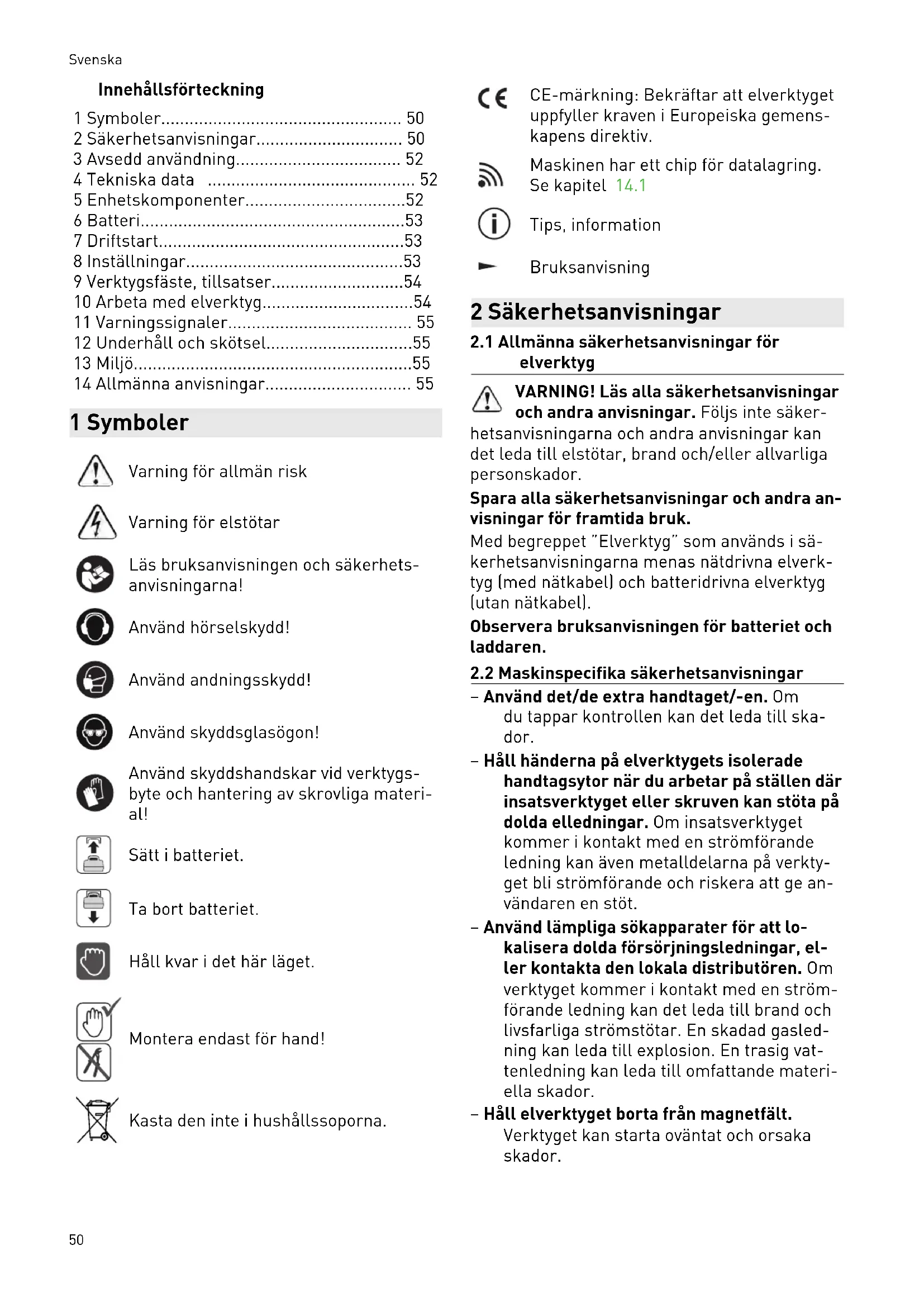 - 14 Allmänna anvisningar 1 Symboler Varning för allmän risk Varning för elstötar Läs bruksanvisningen och säkerhets anvisningarna! Använd hörselskydd! Använd andningsskydd! Använd skyddsglasögon! Använd skyddshandskar vid verktygs byte och hantering av skrovliga materi al! Sätt i batteriet. Ta bort batteriet. Håll kvar i det här läget. Montera endast för hand! Kasta den inte i hushållssoporna. CE-märkning: Bekräftar att elverktyget uppfyller kraven i Europeiska gemens kapens direktiv. Maskinen har ett chip för datalagring. Se kapitel 14.1 Tips, information Bruksanvisning 2 Säkerhetsanvisningar p. 55
