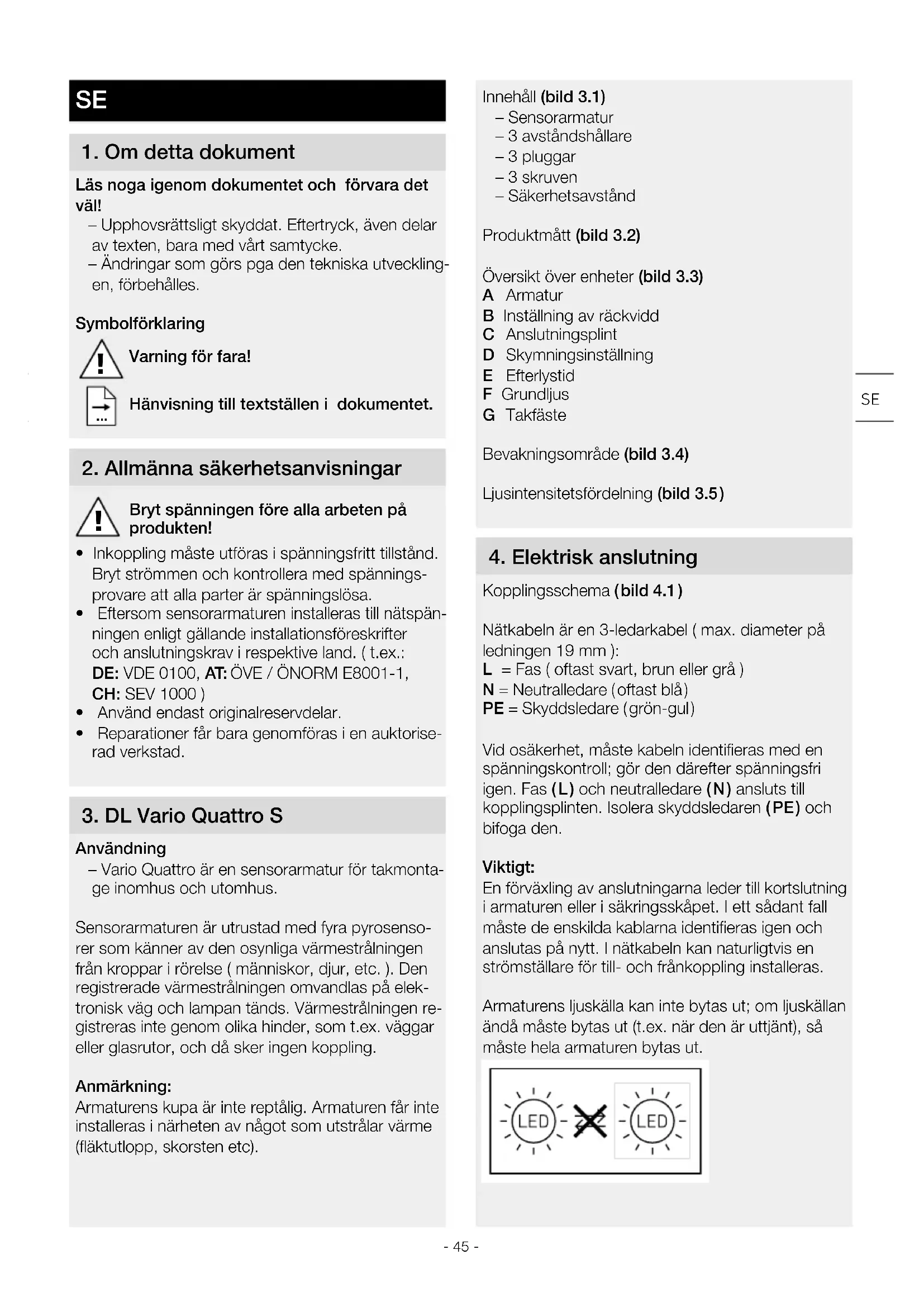 Användning – Vario Quattro är en sensorarmatur för takmonta- ge inomhus och utomhus. Sensorarmaturen är utrustad med fyra pyrosenso- rer som känner av den osynliga värmestrålningen från kroppar i rörelse ( människor, djur, etc. ). Den registrerade värmestrålningen omvandlas på elek- tronisk väg och lampan tänds. Värmestrålningen re- gistreras inte genom olika hinder, som t.ex. väggar eller glasrutor, och då sker ingen koppling. Anmärkning: Armaturens kupa är inte reptålig. Armaturen får inte installeras i närheten av något som utstrålar värme (fläktutlopp, skorsten etc).