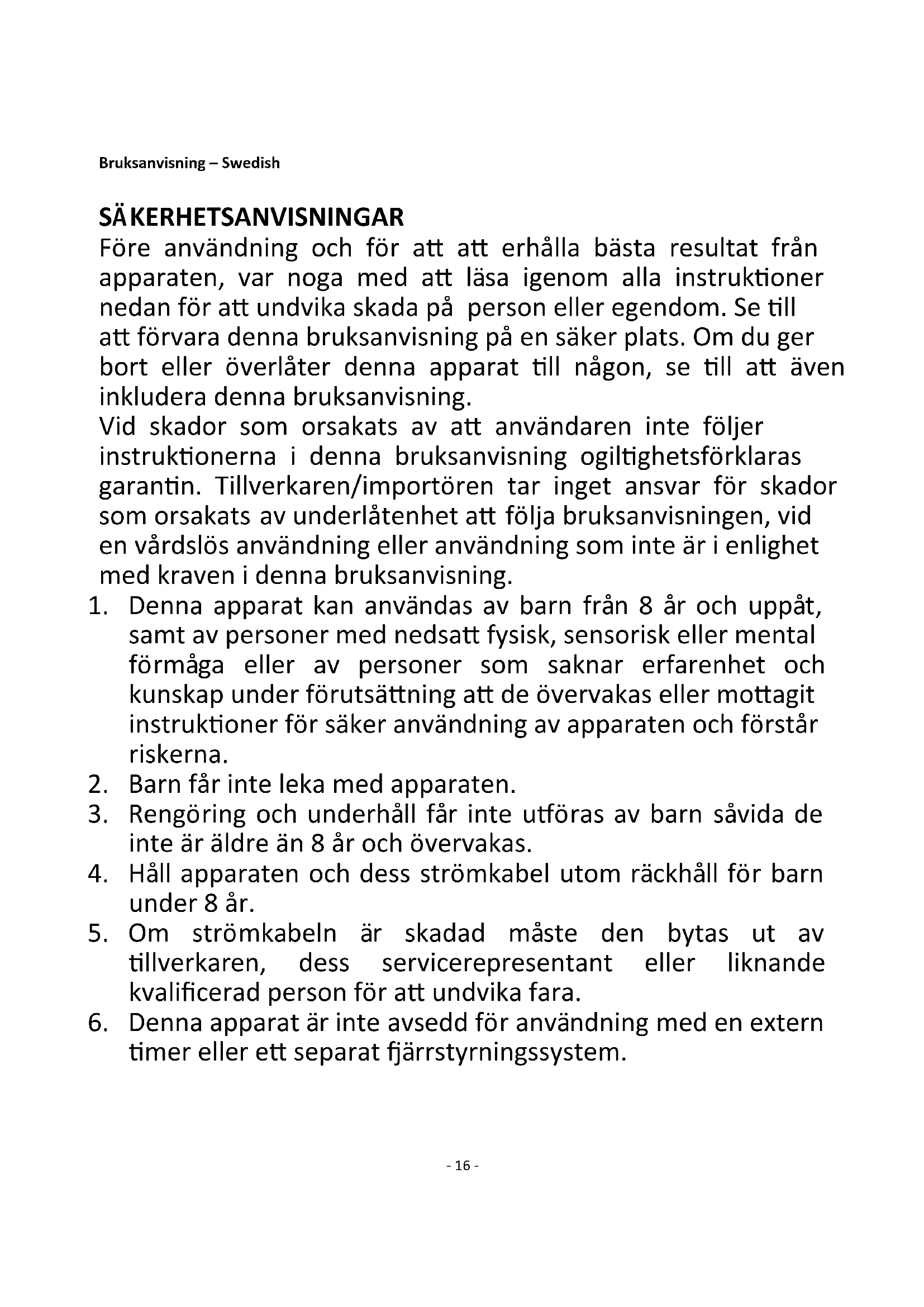 Recyclage – Directive européenne 2012/19/EU Ce symbole indique que le produit ne doit pas être jeté avec les ordures ménagères. Pour limiter les risques pour l’environnement et la santé entraînés par le rejet non contrôlé des déchets, recyclez ce dernier pour promouvoir une réutilisation responsable de ses matériaux. Pour recycler votre produit, utilisez les réseaux de collecte de votre région ou prenez contact avec le revendeur du produit. Ce dernier pourra vous aider à le recycler. POCO Service AG Industriestraße 17 59192 Bergkamen Germany- 16 - Bruksanvisning – Swedish SÄKERHETSANVISNINGAR Före användning och för att att erhålla bästa resultat från apparaten, var noga med att läsa igenom alla instruktioner nedan för att undvika skada på person eller egendom. Se till att förvara denna bruksanvisning på en säker plats. Om du ger bort eller överlåter denna apparat till någon, se till att även inkludera denna bruksanvisning. Vid skador som orsakats av att användaren inte följer instruktionerna i denna bruksanvisning ogiltighetsförklaras garantin. Tillverkaren/importören tar inget ansvar för skador som orsakats av underlåtenhet att följa bruksanvisningen, vid en vårdslös användning eller användning som inte är i enlighet med kraven i denna bruksanvisning.