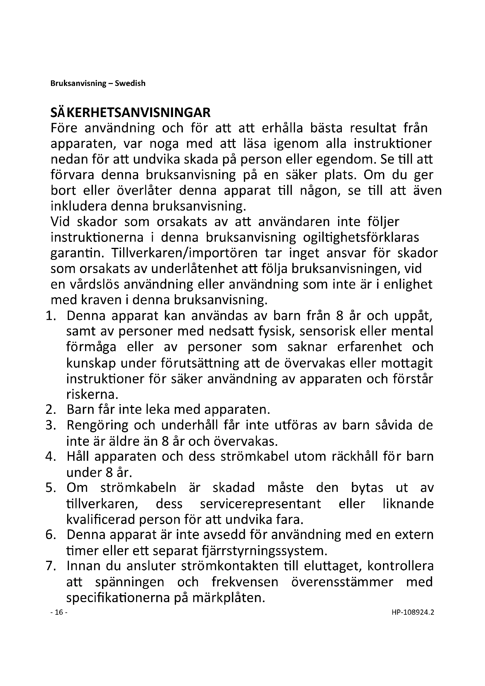 Recyclage – Directive européenne 2012/19/EU Ce symbole indique que le produit ne doit pas être jeté avec les ordures ménagères. Pour limiter les risques pour l’environnement et la santé entraînés par le rejet non contrôlé des déchets, recyclez ce dernier pour promouvoir une réutilisation responsable de ses matériaux. Pour recycler votre produit, utilisez les réseaux de collecte de votre région ou prenez contact avec le revendeur du produit. Ce dernier pourra vous aider à le recycler. POCO Service AG Industriestraße 17 59192 Bergkamen Germany- 16 - HP-108924.2 Bruksanvisning – Swedish SÄKERHETSANVISNINGAR Före användning och för att att erhålla bästa resultat från apparaten, var noga med att läsa igenom alla instruktioner nedan för att undvika skada på person eller egendom. Se till att förvara denna bruksanvisning på en säker plats. Om du ger bort eller överlåter denna apparat till någon, se till att även inkludera denna bruksanvisning. Vid skador som orsakats av att användaren inte följer instruktionerna i denna bruksanvisning ogiltighetsförklaras garantin. Tillverkaren/importören tar inget ansvar för skador som orsakats av underlåtenhet att följa bruksanvisningen, vid en vårdslös användning eller användning som inte är i enlighet med kraven i denna bruksanvisning.