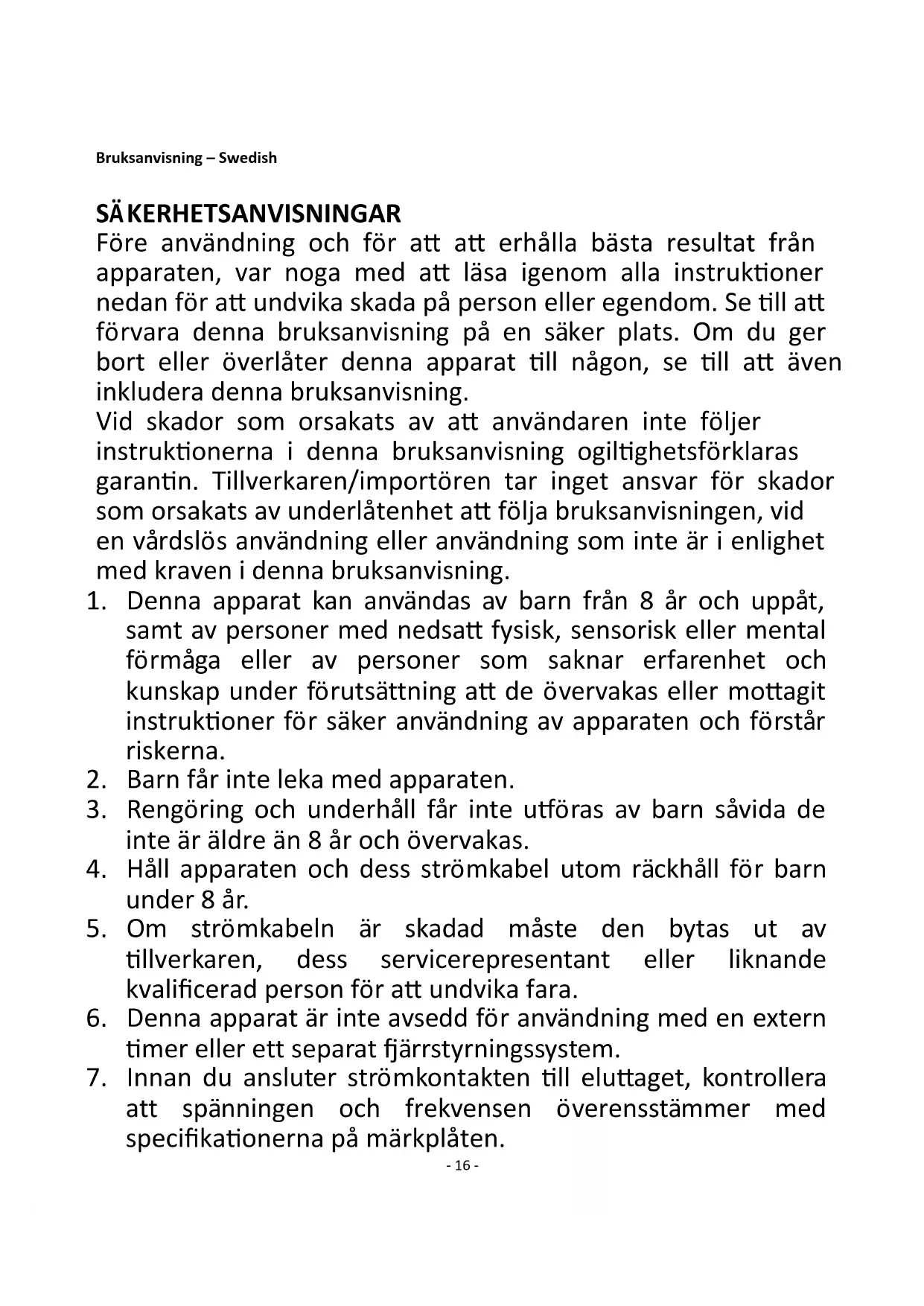 17. Använd inte apparaten för något annat ändamål än den är