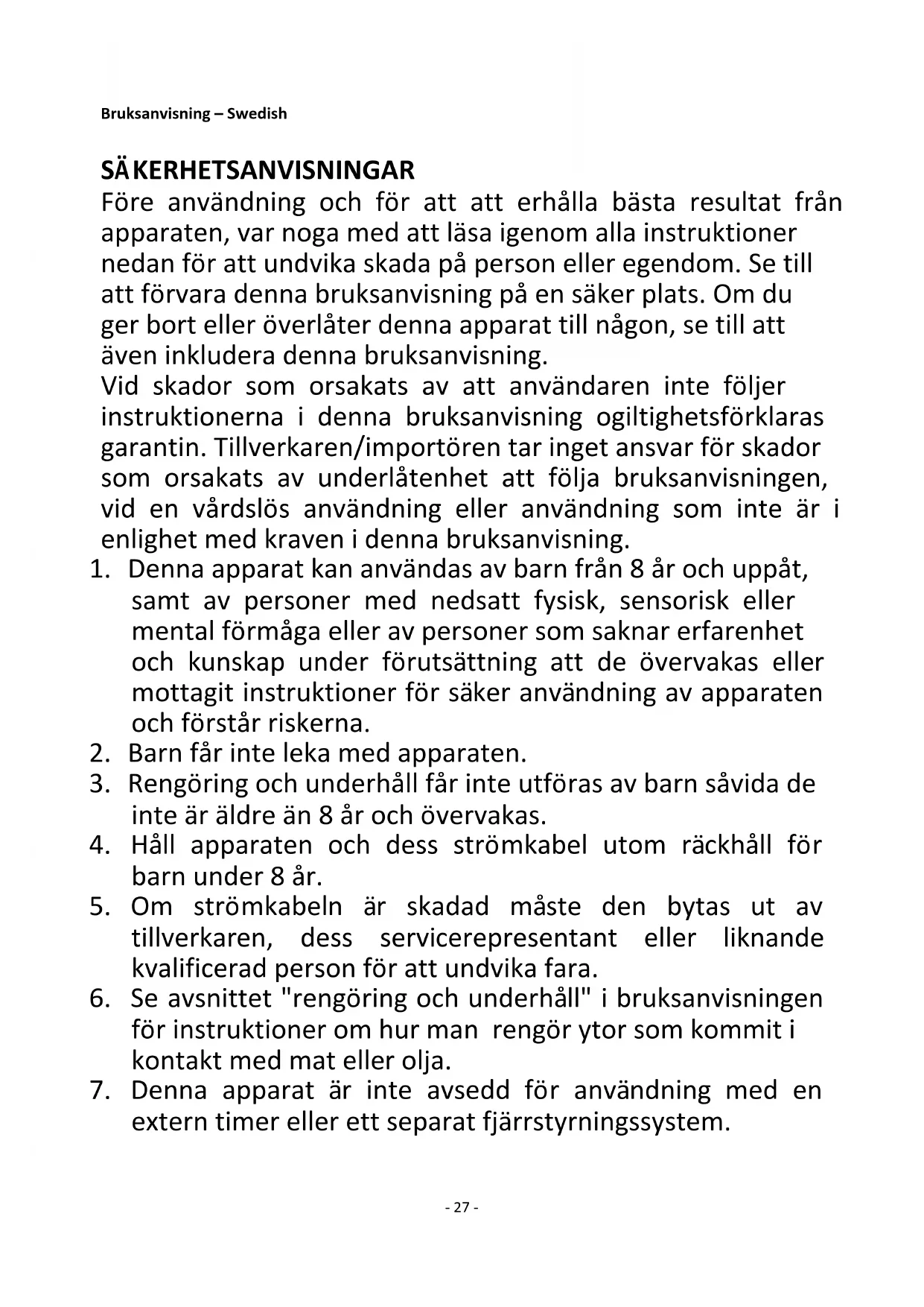 Recyclage – Directive européenne 2012/19/EU Ce symbole indique que le produit ne doit pas être jeté avec les ordures ménagères. Pour limiter les risques pour l’environnement et la santé entraînés par le rejet non contrôlé des déchets, recyclez ce dernier pour promouvoir une réutilisation responsable de ses matériaux. Pour recycler votre produit, utilisez les réseaux de collecte de votre région ou prenez contact avec le revendeur du produit. Ce dernier pourra vous aider à le recycler. Emerio Deutschland GmbH (no service address) Lerchenweg 3 40789 Monheim am Rhein Deutschland Service a la clientele: T: +49 (0) 3222 1097 600 E: info.de@emerio.eu- 27 - Bruksanvisning – Swedish SÄKERHETSANVISNINGAR Före användning och för att att erhålla bästa resultat från apparaten, var noga med att läsa igenom alla instruktioner nedan för att undvika skada på person eller egendom. Se till att förvara denna bruksanvisning på en säker plats. Om du ger bort eller överlåter denna apparat till någon, se till att även inkludera denna bruksanvisning. Vid skador som orsakats av att användaren inte följer instruktionerna i denna bruksanvisning ogiltighetsförklaras garantin. Tillverkaren/importören tar inget ansvar för skador som orsakats av underlåtenhet att följa bruksanvisningen, vid en vårdslös användning eller användning som inte är i enlighet med kraven i denna bruksanvisning.
