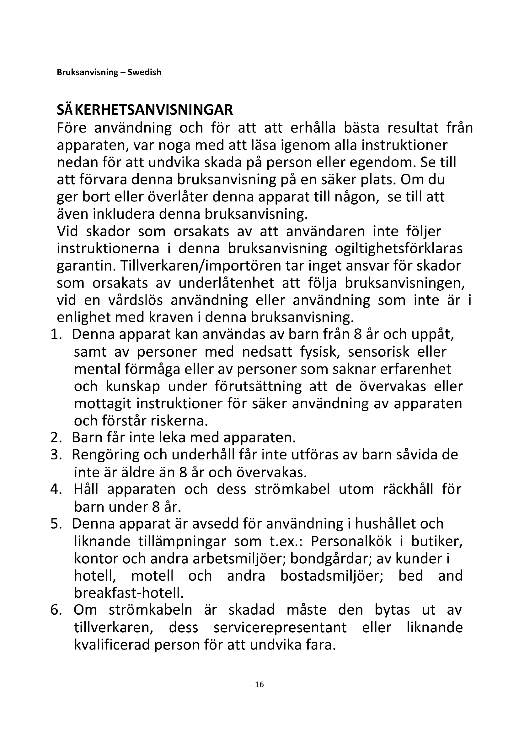 5. Denna apparat är avsedd för användning i hushållet och