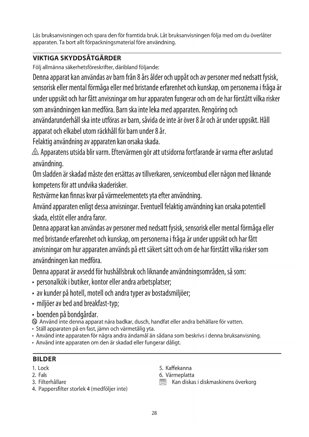 Följ allmänna säkerhetsföreskrifter, däribland följande: Denna apparat kan användas av barn från 8 års ålder och uppåt och av personer med nedsatt fysisk, sensorisk eller mental förmåga eller med bristande erfarenhet och kunskap, om personerna i fråga är under uppsikt och har fått anvisningar om hur apparaten fungerar och om de har förstått vilka risker som användningen kan medföra. Barn ska inte leka med apparaten. Rengöring och användarunderhåll ska inte utföras av barn, såvida de inte är över 8 år och är under uppsikt. Håll apparat och elkabel utom räckhåll för barn under 8 år. Felaktig användning av apparaten kan orsaka skada. h Apparatens utsida blir varm. Eftervärmen gör att utsidorna fortfarande är varma efter avslutad användning. Om sladden är skadad måste den ersättas av tillverkaren, serviceombud eller någon med liknande kompetens för att undvika skaderisker. Restvärme kan nnas kvar på värmeelementets yta efter användning. Använd apparaten enligt dessa anvisningar. Eventuell felaktig användning kan orsaka potentiell skada, elstöt eller andra faror. Denna apparat kan användas av personer med nedsatt fysisk, sensorisk eller mental förmåga eller med bristande erfarenhet och kunskap, om personerna i fråga är under uppsikt och har fått anvisningar om hur apparaten används på ett säkert sätt och om de har förstått vilka risker som användningen kan medföra. Denna apparat är avsedd för hushållsbruk och liknande användningsområden, så som: