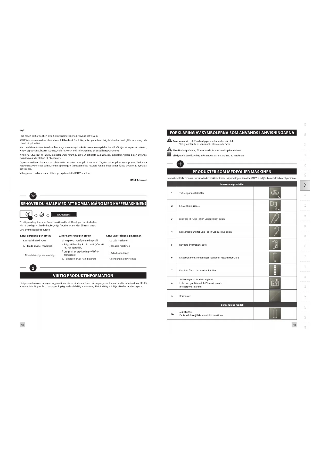 a. Tillreda kaedrycker d. Skapa och kongurera din prol h. Skölja maskinen b. Tillreda drycker med mjölke. Lägga till en dryck i din prol (efter att du har gjort den)i. Rengöra maskinenc. Tillreda två drycker samtidigtf. Lägga till en dryck i din prol (från prolsidan)j. Avkalka maskineng. Ta bort en dryck från din prol k. Rengöra mjölksystemet VIKTIG PRODUKTINFORMATION Läs igenom bruksanvisningen noggrant innan du använder maskinen första gången och spara den för framtida bruk. KRUPS ansvarar inte för problem som uppstår på grund av felaktig användning. Det är viktigt att följa säkerhetsanvisningarna. FÖRKLARING AV SYMBOLERNA SOM ANVÄNDS I ANVISNINGARNA Fara: Varnar vid risk för allvarlig personskada eller dödsfall. Blixtsymbolen är en varning för elrelaterade faror. Var försiktig: Varning för eventuella fel eller skador på maskinen.