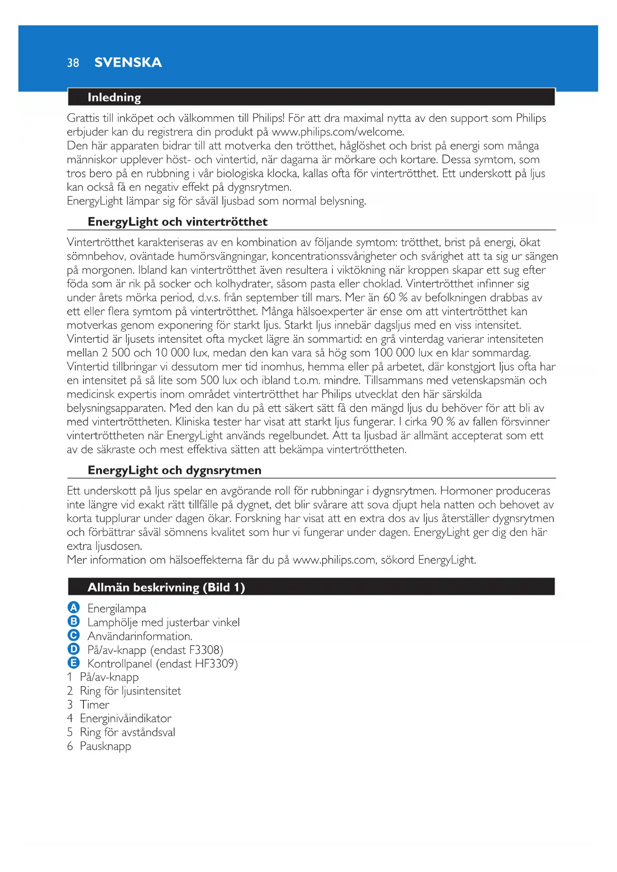 NORSK 3738 Inledning Grattis till inköpet och välkommen till Philips! För att dra maximal nytta av den support som Philips erbjuder kan du registrera din produkt på www.philips.com/welcome. Den här apparaten bidrar till att motverka den trötthet, håglöshet och brist på energi som många människor upplever höst- och vintertid, när dagarna är mörkare och kortare. Dessa symtom, som tros bero på en rubbning i vår biologiska klocka, kallas ofta för vintertrötthet. Ett underskott på ljus kan också få en negativ effekt på dygnsrytmen. EnergyLight lämpar sig för såväl ljusbad som normal belysning. EnergyLight och vintertrötthet Vintertrötthet karakteriseras av en kombination av följande symtom: trötthet, brist på energi, ökat sömnbehov, oväntade humörsvängningar, koncentrationssvårigheter och svårighet att ta sig ur sängen på morgonen. Ibland kan vintertrötthet även resultera i viktökning när kroppen skapar ett sug efter föda som är rik på socker och kolhydrater, såsom pasta eller choklad. Vintertrötthet innner sig under årets mörka period, d.v.s. från september till mars. Mer än 60 % av befolkningen drabbas av ett eller era symtom på vintertrötthet. Många hälsoexperter är ense om att vintertrötthet kan motverkas genom exponering för starkt ljus. Starkt ljus innebär dagsljus med en viss intensitet. Vintertid är ljusets intensitet ofta mycket lägre än sommartid: en grå vinterdag varierar intensiteten mellan 2 500 och 10 000 lux, medan den kan vara så hög som 100 000 lux en klar sommardag. Vintertid tillbringar vi dessutom mer tid inomhus, hemma eller på arbetet, där konstgjort ljus ofta har en intensitet på så lite som 500 lux och ibland t.o.m. mindre. Tillsammans med vetenskapsmän och medicinsk expertis inom området vintertrötthet har Philips utvecklat den här särskilda belysningsapparaten. Med den kan du på ett säkert sätt få den mängd ljus du behöver för att bli av med vintertröttheten. Kliniska tester har visat att starkt ljus fungerar. I cirka 90 % av fallen försvinner vintertröttheten när EnergyLight används regelbundet. Att ta ljusbad är allmänt accepterat som ett av de säkraste och mest effektiva sätten att bekämpa vintertröttheten. EnergyLight och dygnsrytmen Ett underskott på ljus spelar en avgörande roll för rubbningar i dygnsrytmen. Hormoner produceras inte längre vid exakt rätt tillfälle på dygnet, det blir svårare att sova djupt hela natten och behovet av korta tupplurar under dagen ökar. Forskning har visat att en extra dos av ljus återställer dygnsrytmen och förbättrar såväl sömnens kvalitet som hur vi fungerar under dagen. EnergyLight ger dig den här extra ljusdosen. Mer information om hälsoeffekterna får du på www.philips.com, sökord EnergyLight. Allmän beskrivning (Bild 1) A Energilampa B Lamphölje med justerbar vinkel C Användarinformation. D På/av-knapp (endast F3308) E Kontrollpanel (endast HF3309) 1 På/av-knapp 2 Ring för ljusintensitet 3 Timer 4 Energinivåindikator 5 Ring för avståndsval 6 Pausknapp SVENSKAViktigt Läs användarhandboken noggrant innan du använder apparaten och spara den för framtida bruk. Fara Vatten och elektricitet är en farlig kombination! Använd inte apparaten i våta miljöer (t.ex. i badrummet eller i närheten av en dusch eller simbassäng). Varning Kontrollera att den spänning som anges på apparaten överensstämmer med den lokala nätspänningen innan du ansluter apparaten. Om nätsladden är skadad måste den alltid bytas ut av Philips, ett av Philips auktoriserade serviceombud eller liknande behöriga personer för att undvika olyckor. Apparaten är inte avsedd för användning av personer (inklusive barn) med olika funktionshinder, eller av personer som inte har kunskap om hur apparaten används, om de inte övervakas eller får instruktioner angående användning av apparaten av en person som är ansvarig för deras säkerhet. Små barn ska övervakas så att de inte kan leka med apparaten. Varning! Dra alltid ut nätsladden efter användning. Använd inte apparaten i ett rum som inte är upplyst av någon annan lampa. Använd ljuset från apparaten som ett tillskott till det normala ljuset (solljus, elektriskt ljus) i hemmet. Titta inte in i ljuset för länge. Rådfråga läkare innan du använder Philips EnergyLight om: 1 du lider av eller har lidit av en allvarlig depression. 2 du är överkänslig mot ljus (t.ex. p.g.a. diabetes eller epilepsi). 3 du har problem med ögonen. 4 du står under speciell medicinering (vissa antidepressiva, psykotropiska preparat eller malariatabletter). 5 du har högt blodtryck. Om användning av apparaten medför att du blir för aktiv råder vi dig att minska exponeringen för starkt ljus. Om ingen förbättring sker kontaktar du läkare. Om du känner dig utmattad, sliten eller rastlös och/eller drabbas av sömnproblem (t.ex. insomningssvårigheter) efter att du har använt apparaten råder vi dig att kontakta läkare eller psykoterapeut. Allmänt Ljusbadets varaktighet beror på avståndet till apparaten. I kapitlet Använda apparaten nns uppgifter om lämpligt avstånd och tid. Efter de första ljusbaden kan du uppleva viss ögontrötthet och/eller lätt huvudvärk. Dessa biverkningar bör snabbt försvinna. Den här apparaten uppfyller kraven i direktivet för medicinska enheter, MDD 93/42/ EEG (Bild 2). Använda apparaten Vi rekommenderar att du börjar använda EnergyLight så snart du känner vintertröttheten nalkas eller när du känner att du behöver extra ljus. Du bör helst ta dina ljusbad mellan kl 6 på morgonen och kl 8 på kvällen. (Bild 3) Tips: Om du vill ställa om din biologiska klocka rekommenderar vi att du tar ett extra ljusbad på morgonen, omedelbart efter att du har vaknat. 1 Placera apparaten på ett bord. 2 Sätt i stickkontakten i vägguttaget.