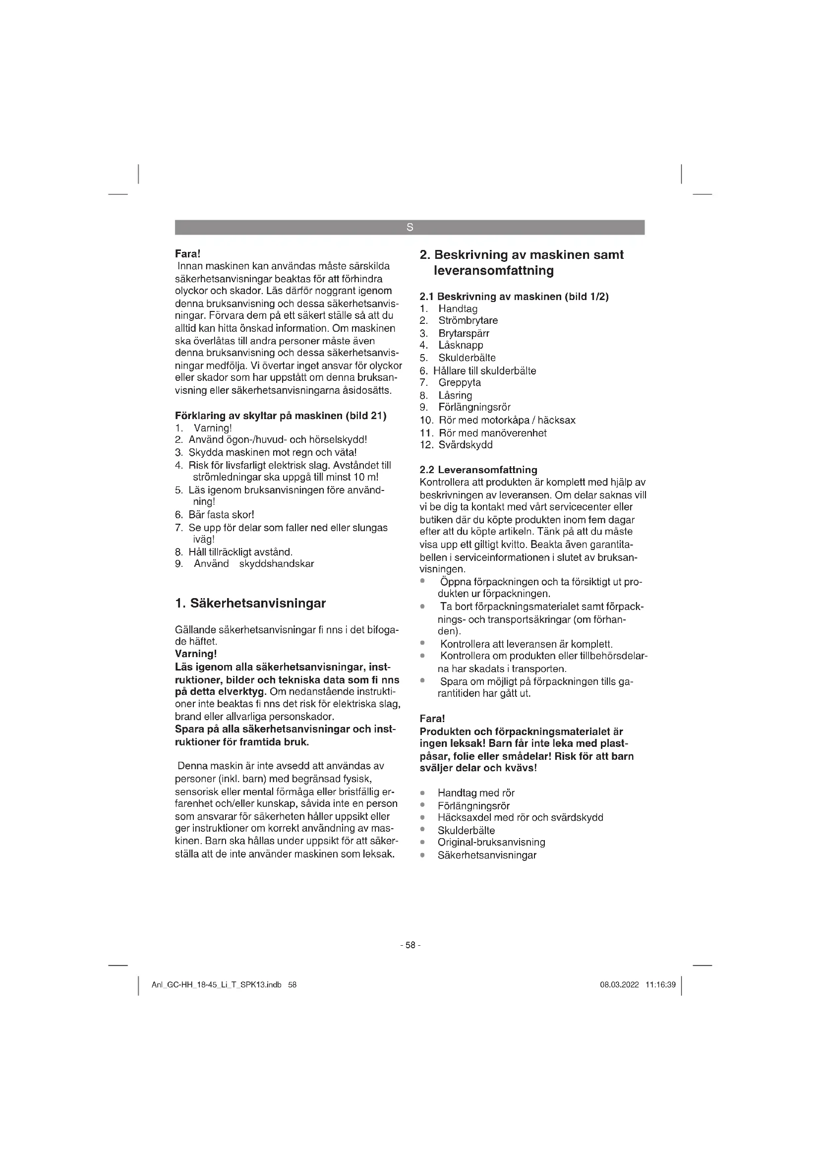 Maskinen levereras utan batterier och utan lad- dare. Tänk på att maskinen endast får användas med Li-jon-batterier från serien Power-X-Change! Obs! Montera inte batteriet förrän maskinen har monterats komplett och samtliga inställningar har genomförts. För att undvika skador ska du alltid bära skyddshandskar när du utför arbeten på maskinen. Använd svärdskyddet (bild 2, pos. 12) Anl_GC-HH_18-45_Li_T_SPK13.indb 59Anl_GC-HH_18-45_Li_T_SPK13.indb 59 08.03.2022 11:16:4008.03.2022 11:16:40S