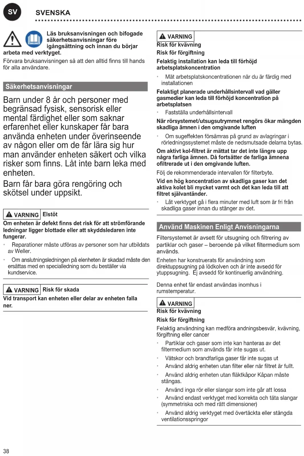 - Låtverktygetgåieraminutermedluftsomärfrifrån skadligagaserinnandustängeravdet. Använd Maskinen Enligt Anvisningarna Filtersystemet är avsett för utsugning och ltrering av partiklar och gaser – beroende på vilket ltermedium som används. Enheten har konstruerats för användning som direktuppsugning på lödkolven och är inte avsedd för ytuppsugning. Ej avsedd för kontinuerlig användning. Denna enhet får endast användas inomhus i rumstemperatur. VARNING Risk för kvävning Risk för förgiftning Felaktig användning kan medföra andningsbesvär, kvävning, förgiftning eller cancer