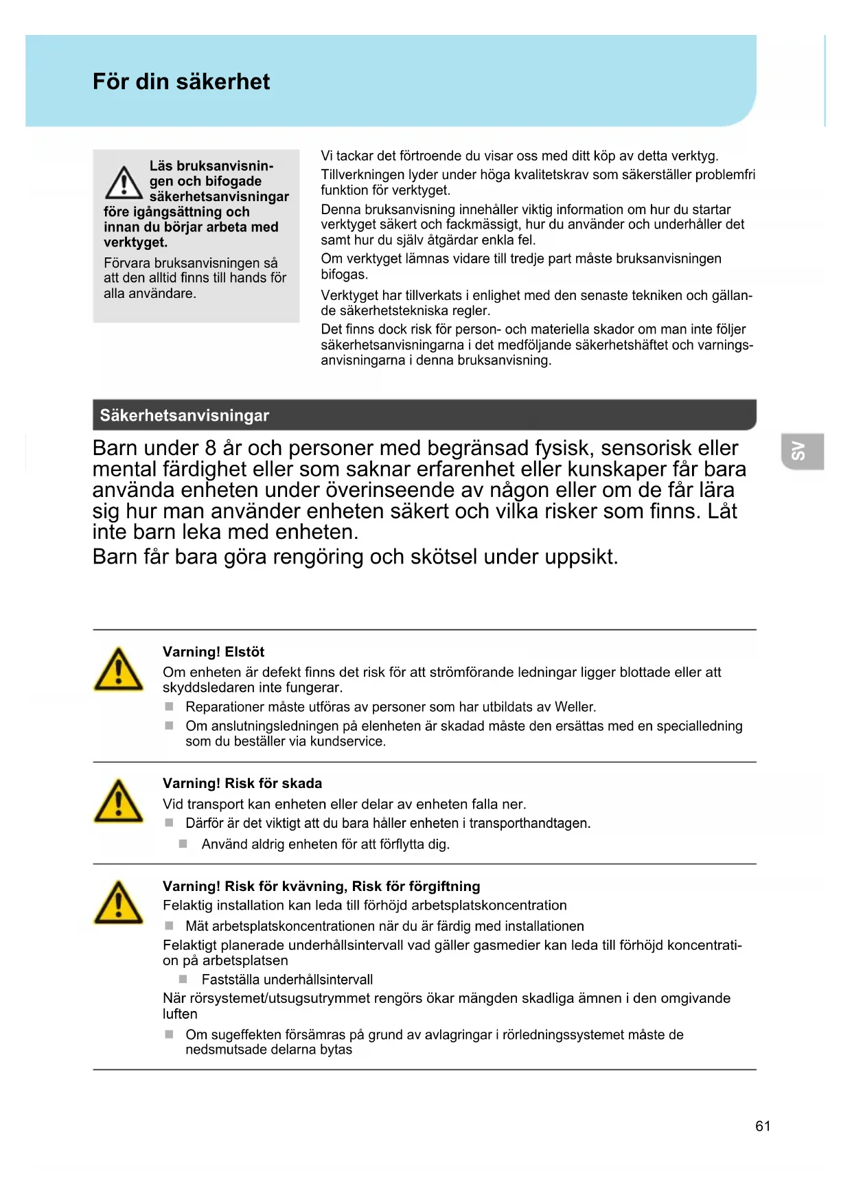 itackardetfrtroendeduvisarossmeddittkpavdettaverktyg Tillverkningenlyderunderhgakvalitetskravsomskerstllerprolemfri funktionfrverktyget Denna bruksanvisning innehåller viktig information om hur du startar verktygetskertochfackmssigthurduanvnderochunderhllerdet samt hur du själv åtgärdar enkla fel. Omverktygetlmnasvidaretilltredjepartmsteruksanvisningen bifogas. erktygethartillverkatsienlighetmeddensenasteteknikenochgllan- de säkerhetstekniska regler. etnnsdockriskfrpersonochmateriellaskadorommanintefljer säkerhetsanvisningarna i det medföljande säkerhetshäftet och varnings- anvisningarna i denna bruksanvisning. För din säkerhet Läs bruksanvisnin- gen och bifogade säkerhetsanvisningar före igångsättning och innan du börjar arbeta med verktyget. Förvara bruksanvisningen så attdenalltidnnstillhandsfr alla användare. Säkerhetsanvisningar arnunderrochpersonermedegrnsadfysisksensoriskeller mental färdighet eller som saknar erfarenhet eller kunskaper får bara använda enheten under överinseende av någon eller om de får lära sighurmananvnderenhetenskertochvilkariskersomnnst inte barn leka med enheten. arnfraragrarengringochsktselunderuppsikt Varning! Elstöt Omenhetenrdefektnnsdetriskfrattstrmfrandeledningarliggerlottadeelleratt skyddsledarenintefungerar eparationermsteutfrasavpersonersomharutildatsaveller Om anslutningsledningen på elenheten är skadad måste den ersättas med en specialledning som du beställer via kundservice. Varning! Risk för skada Vid transport kan enheten eller delar av enheten falla ner. Därför är det viktigt att du bara håller enheten i transporthandtagen. nvndaldrigenhetenfrattfryttadig Varning! Risk för kvävning, Risk för förgiftning Felaktig installation kan leda till förhöjd arbetsplatskoncentration Mät arbetsplatskoncentrationen när du är färdig med installationen Felaktigt planerade underhållsintervall vad gäller gasmedier kan leda till förhöjd koncentrati- on på arbetsplatsen Fastställa underhållsintervall rrrsystemetutsugsutrymmetrengrskarmngdenskadligamnenidenomgivande luften Omsugeffektenfrsmraspgrundavavlagringarirrledningssystemetmstede nedsmutsadedelarnaytas62