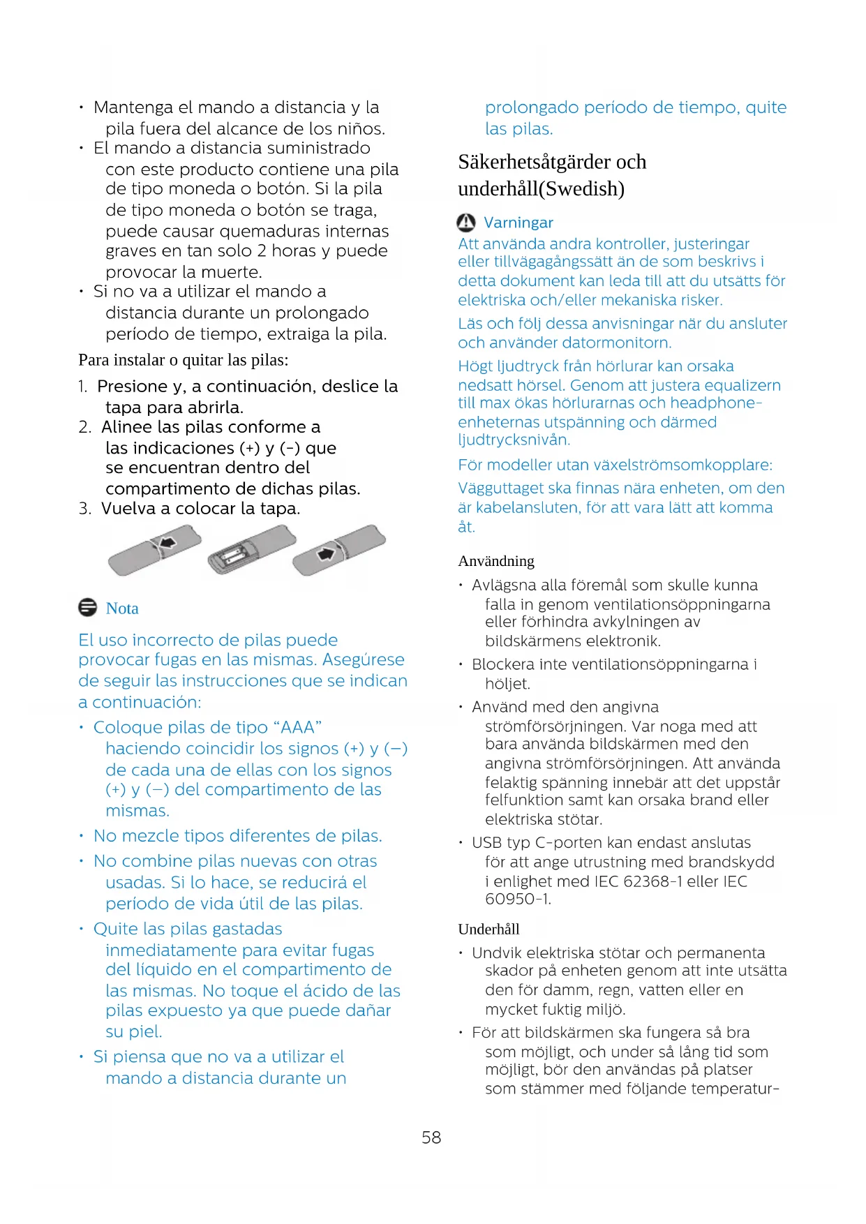 - Si piensa que no va a utilizar el mando a distancia durante un prolongado período de tiempo, quite las pilas. Säkerhetsåtgärder och underhåll(Swedish) Varningar Att använda andra kontroller, justeringar eller tillvägagångssätt än de som beskrivs i detta dokument kan leda till att du utsätts för elektriska och/eller mekaniska risker. Läs och följ dessa anvisningar när du ansluter och använder datormonitorn. Högt ljudtryck från hörlurar kan orsaka nedsatt hörsel. Genom att justera equalizern till max ökas hörlurarnas och headphone- enheternas utspänning och därmed ljudtrycksnivån. För modeller utan växelströmsomkopplare: Vägguttaget ska finnas nära enheten, om den är kabelansluten, för att vara lätt att komma åt. Användning
